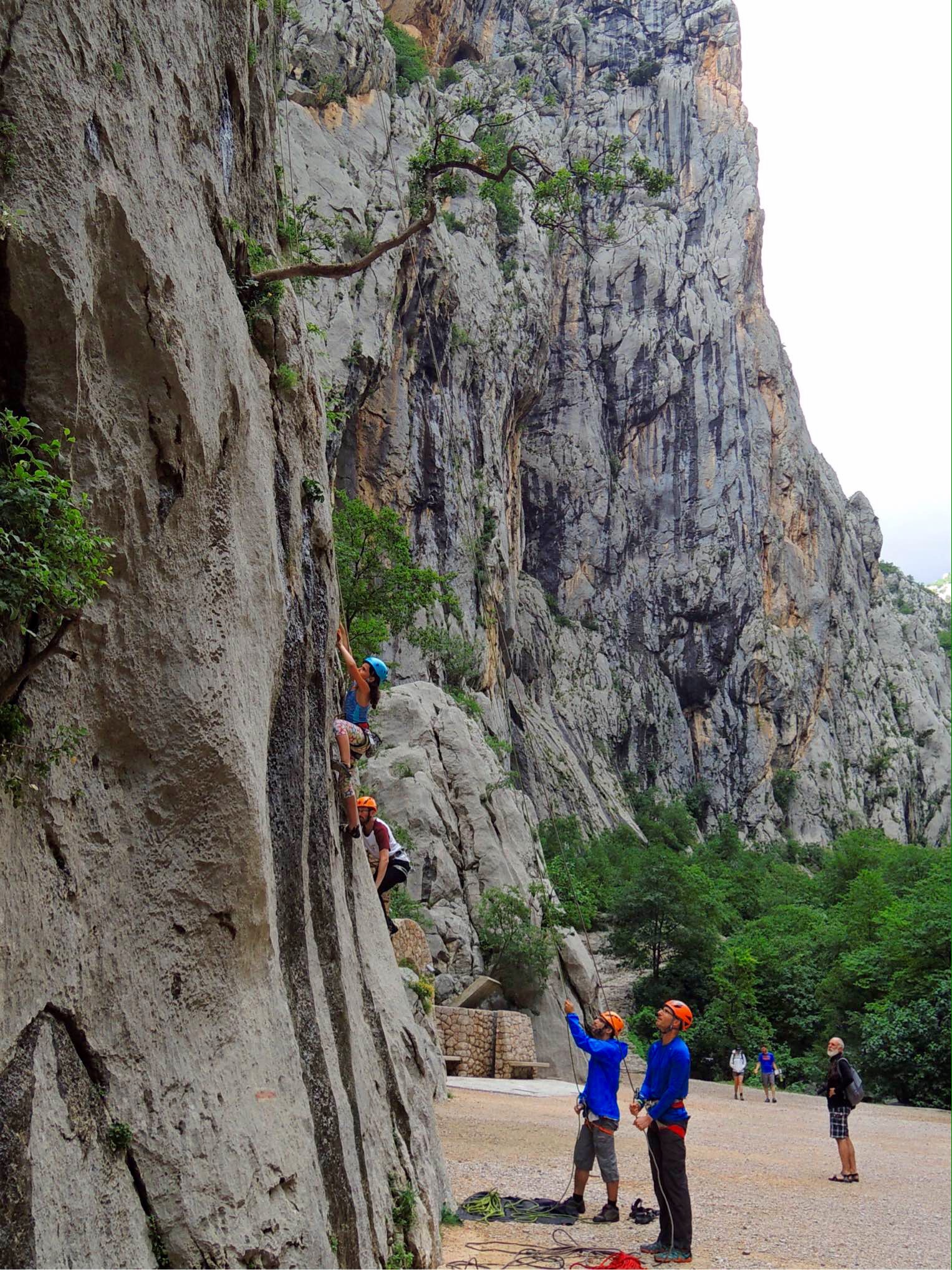 Wir besuchten Pengari, viele steile Routen, bis mittags im Schatten und Befana. Befana ist eine steile versinterte Wand mit Routen bis 35 m. Die Wand ist nordseitig ausgerichtet und daher ideal im Sommer. Auch wenn es, wie bei uns, regnet steht und klettert man hier im trockenen.