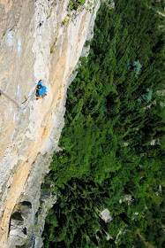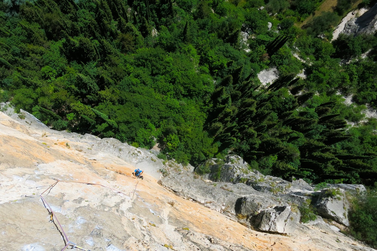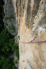 Stefano hat zwar auch ein paar Sitzer kämpft sich aber taper hinauf. Länge 6 und 7 sind dann die ersten „leichten“ im Grad 7-. Nachdem die Sonne nun aus der Wand ist und ich mich etwas erholt habe steige ich diese zwei Längen vor. Die Kletterei ist hier zwar leichter aber die Abstände auch recht weit. Irgendwie gelingt es mir aber mein Selbstvertrauen zurück zu gewinnen und so beschliesse ich auch die 8. und vorletzte Seillänge vorzusteigen. Im Grad 8-/8 steigt man über plattige Stellen und Wasserillen bis zu einer guten Schuppe auf und siehe da mir gelingt alles im Onsight.