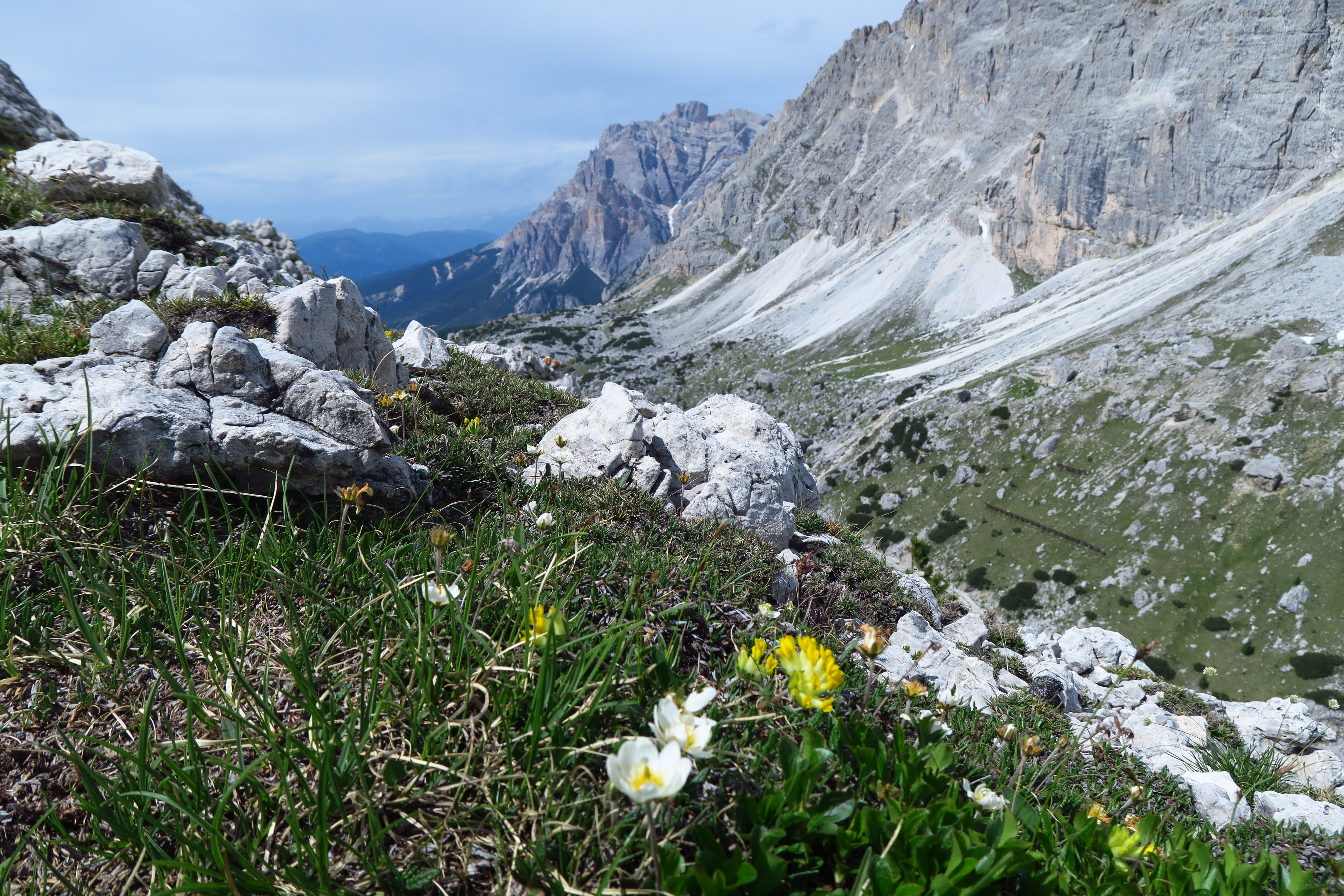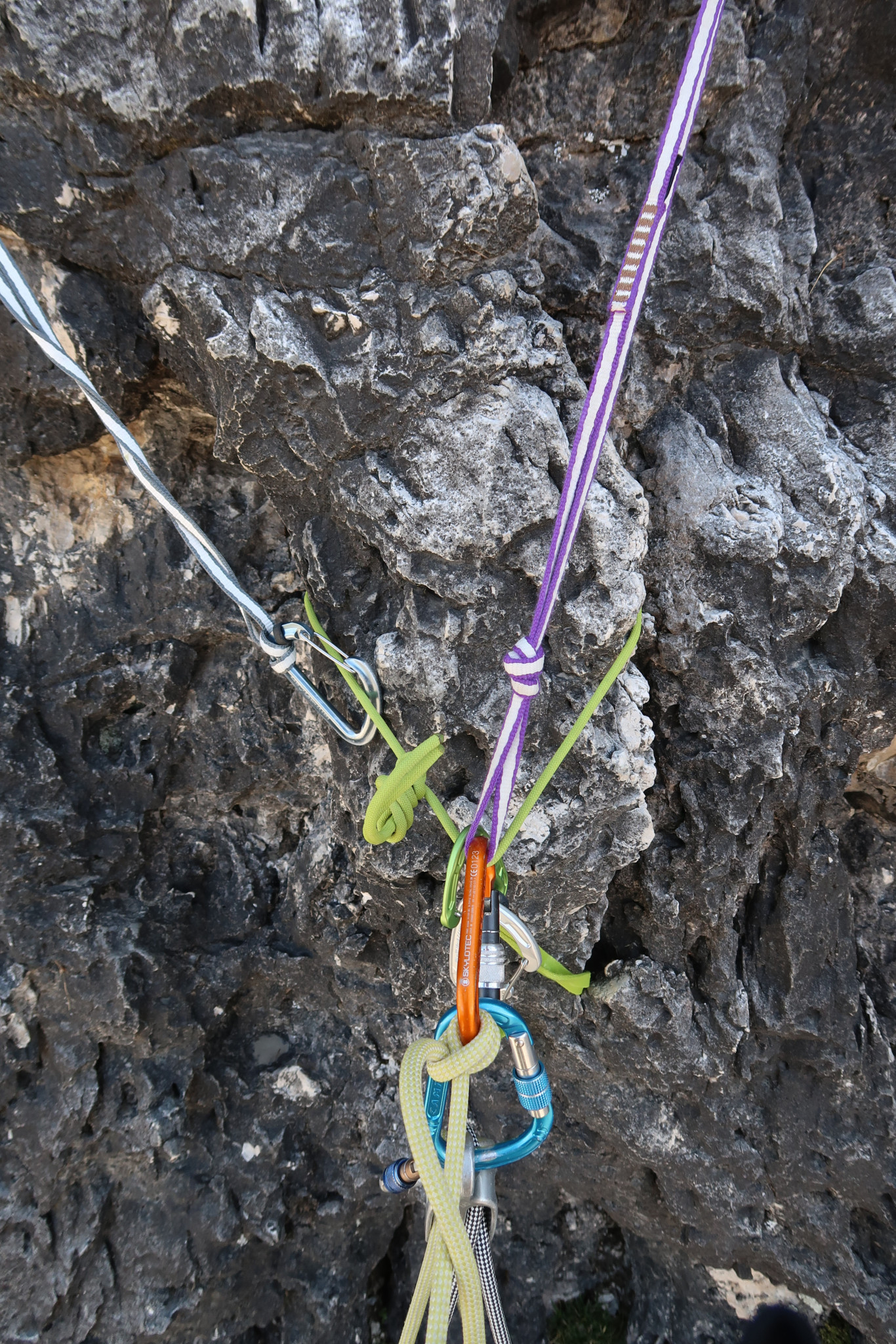Vor den beiden letzten schweren Seillängen gibt es die Möglichkeit über ein Band aus der Tour auszuqueren. Das haben wir auch gemacht da es kurz zu regnen anfing und die Wolken sich immer mehr verdichteten. Ein Grund mehr nochmals zurück zu kommen und auch die letzten Seillängen anzugehen.