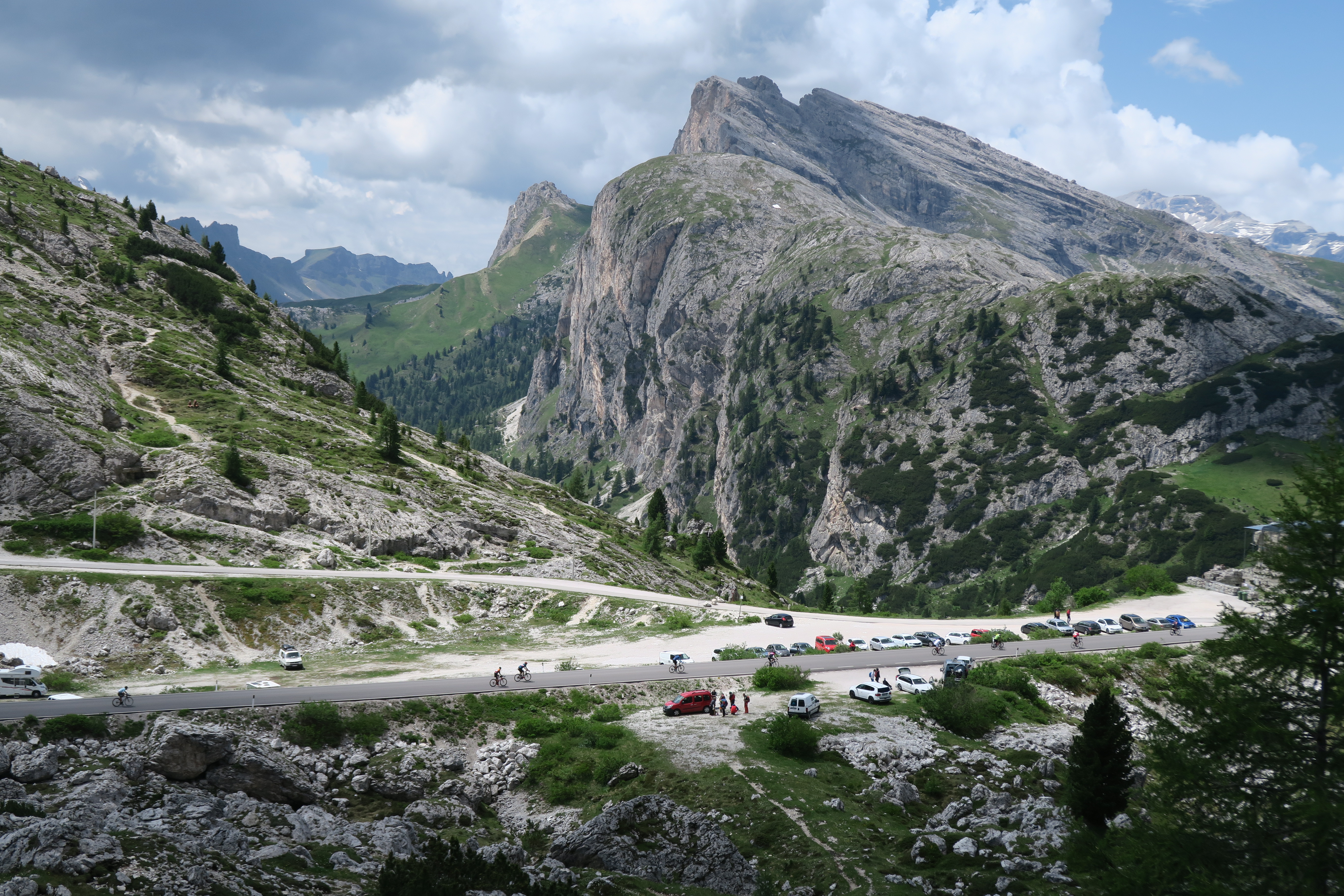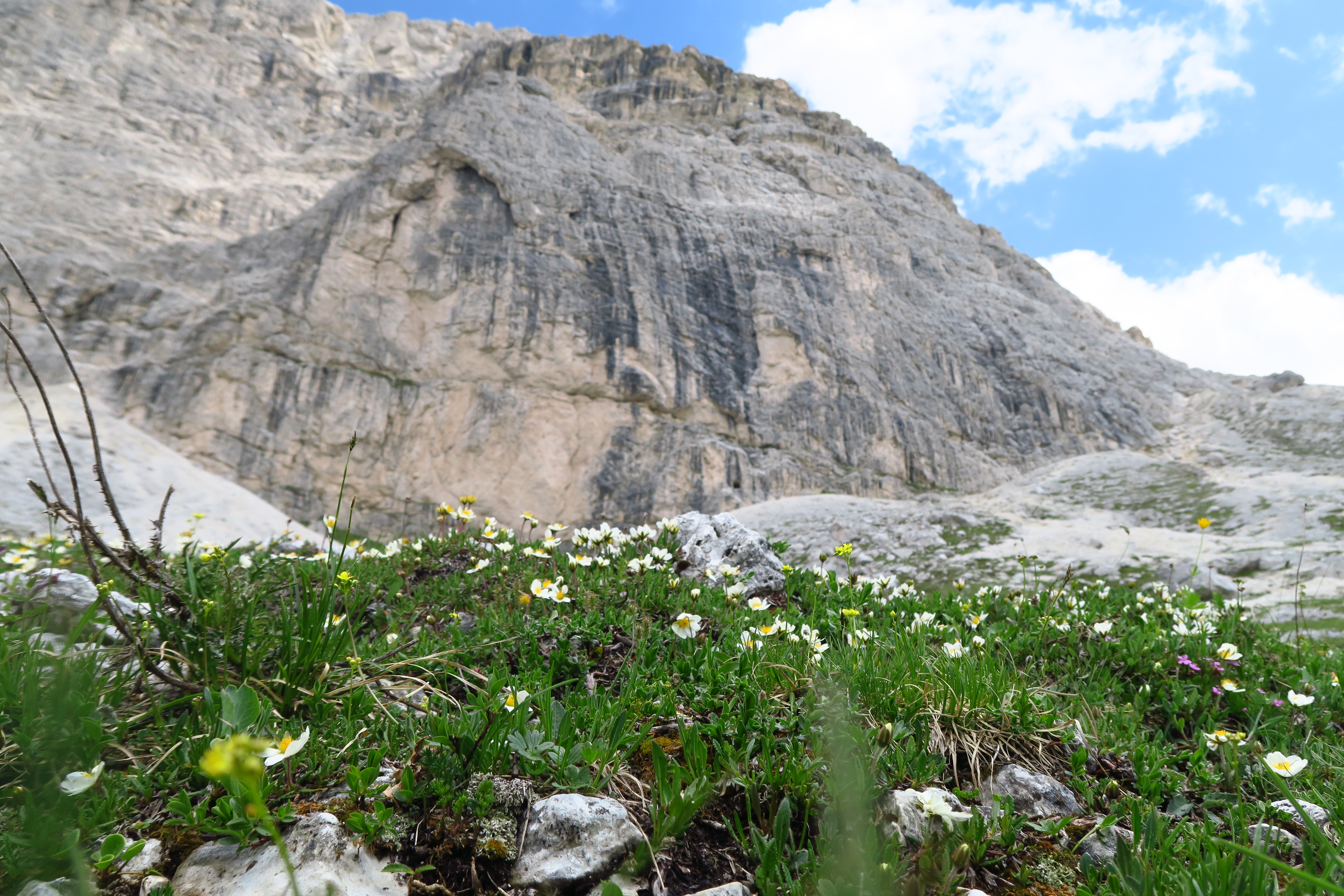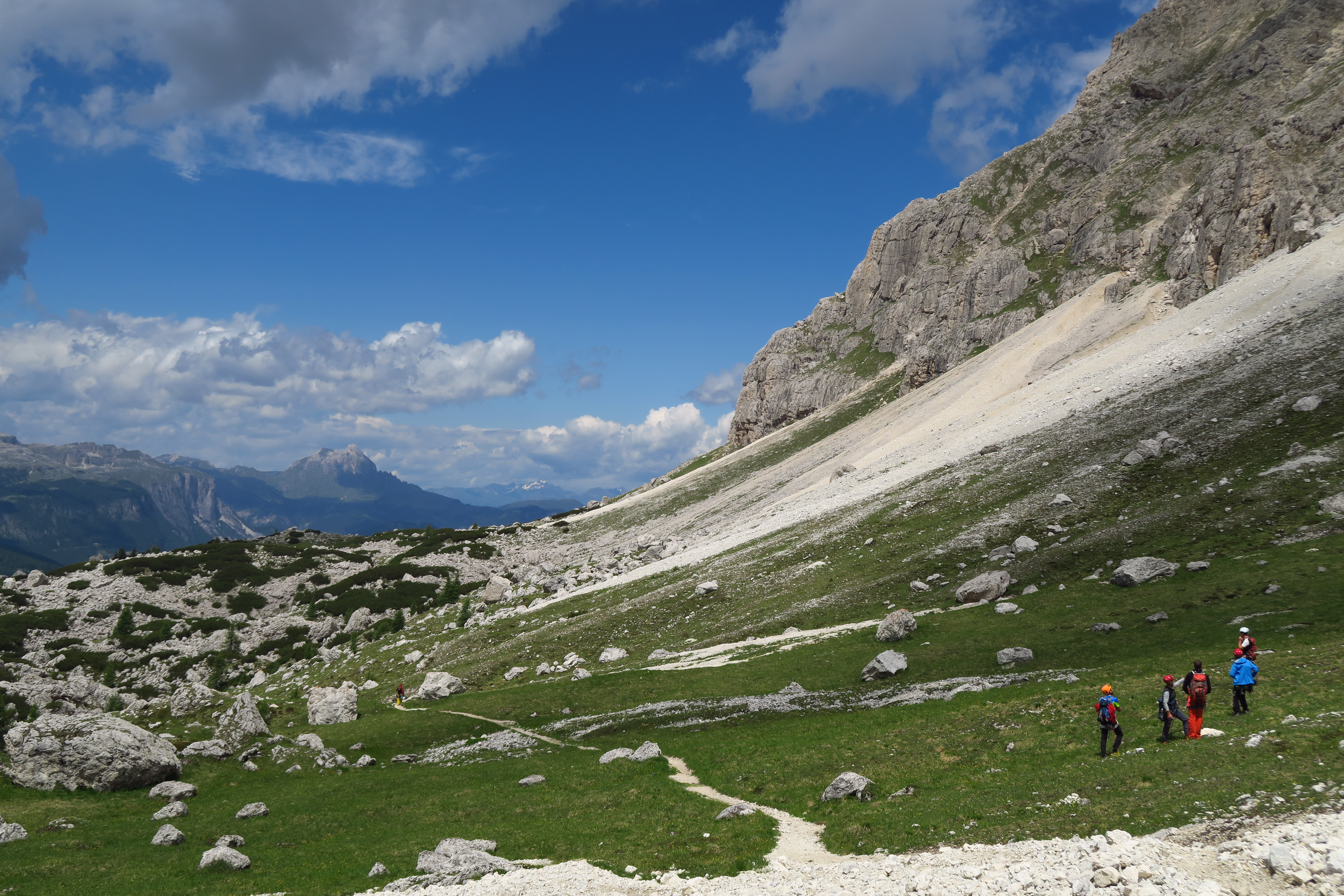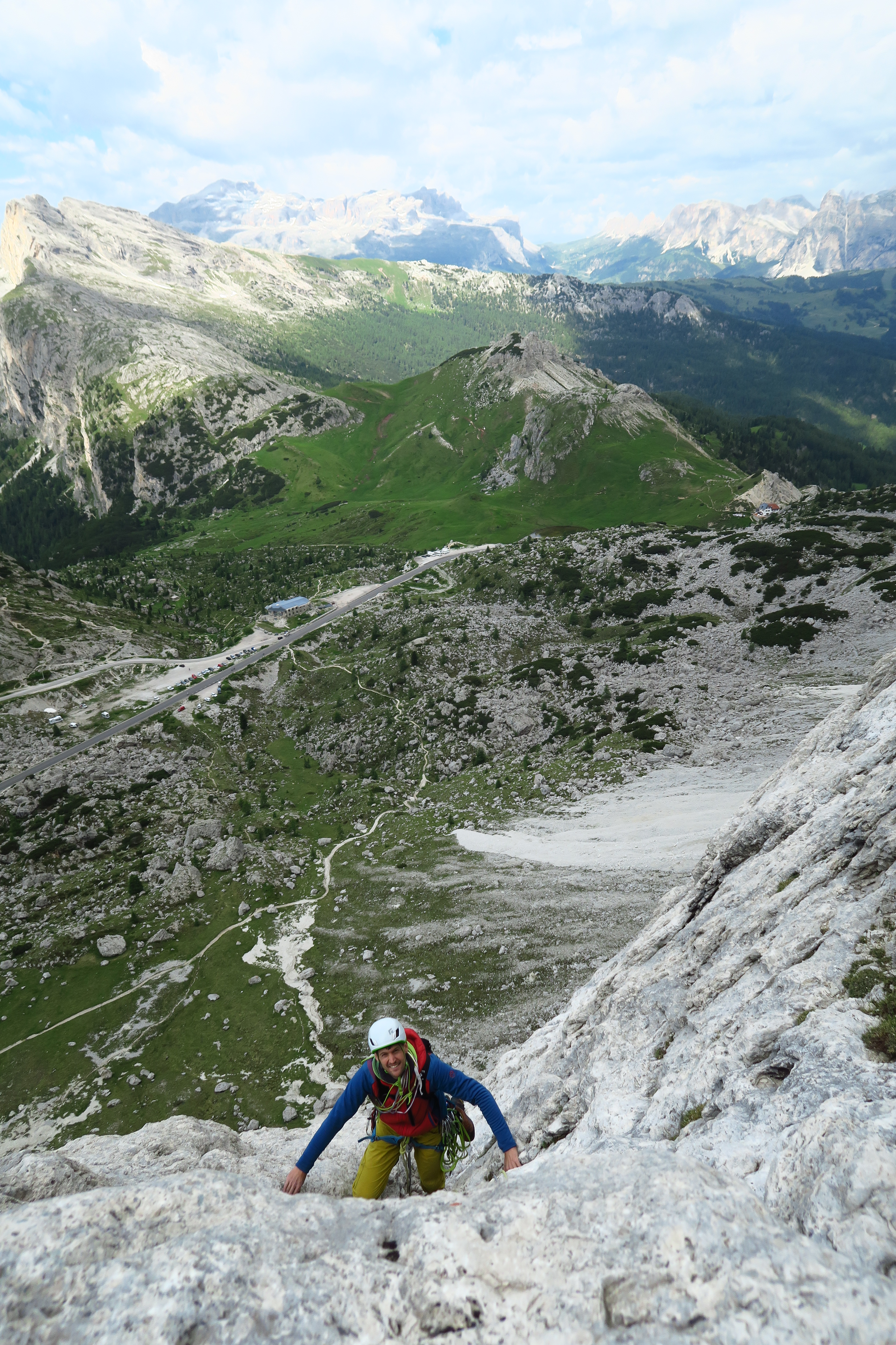 Die Tour verläuft im mittleren Bereich des kleinen Laguzoi durch einen weithin sichtbaren schwarzen Felsstreifen. Durch diesen schwarzen Bereich führt die 2. bzw. 3. Seillänge, je nachdem wo man den ersten Stand macht. In einigen Topos ist die 1. Und 2. Seillänge zusammengeführt. Wir haben jedoch einen Zwischenstand gemacht.