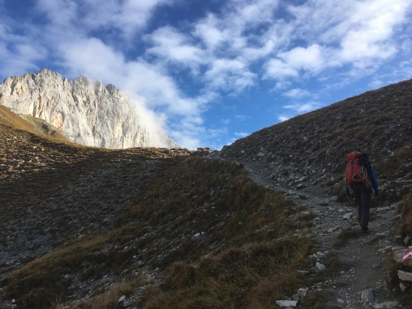 7. SL: Eine ziemlich steile aber kurze Verschneidung will überwunden werden bis man über recht brüchiges Gelände gerade hinauf zum Stand klettert. Achtung links draussen ist der Stand von Doc Holiday.