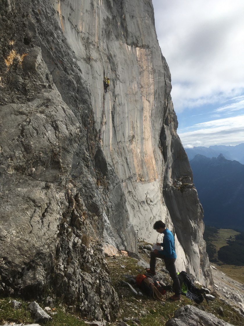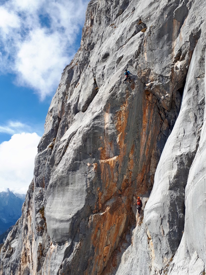 4. SL: Anfangs eine schöne Verschneidung, dann gehts links hinaus über eine steile gut strukturierte Wand bis unter den Überhang.
