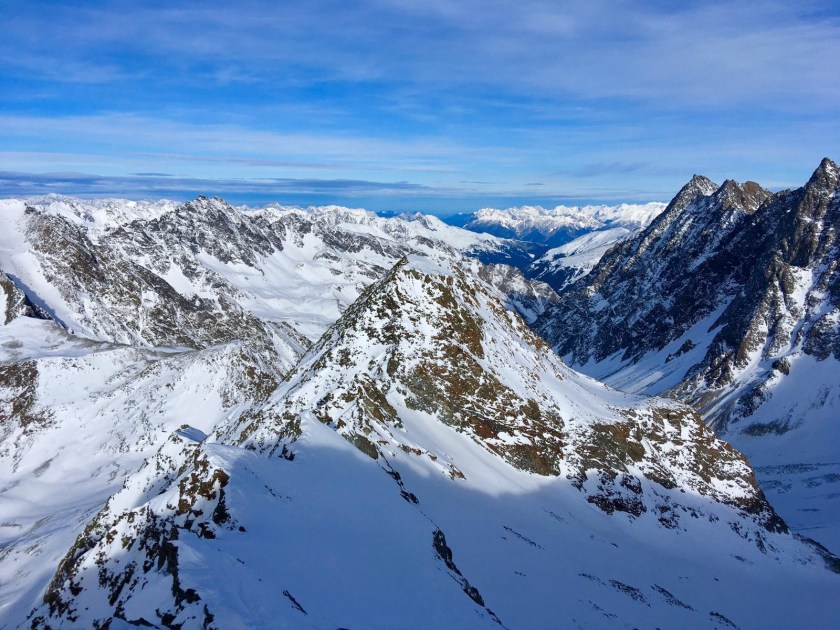 Bei genug Schnee direkt mit den Ski zum Gipfel, sonst kurz vorher Skidepot. Von dort hat man super Ausblicke in die umliegende Bergwelt. Zufällig trafen Stefano und ich dann auch noch auf Reinhard und Denise. Insgesamt waren heute so an die 15 Personen am Gipfel.