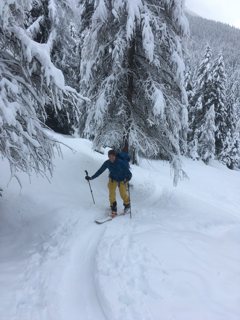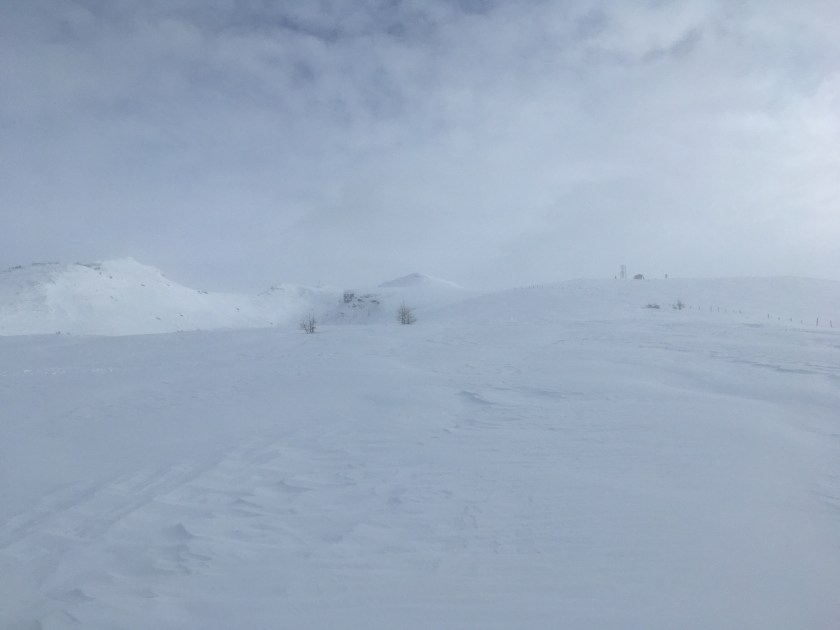 Heute mit gutem, etwas schwerem Pulver bis kurz nach der Hütte. Oben durch Südwestwind gepresst aber gut zu gehen.