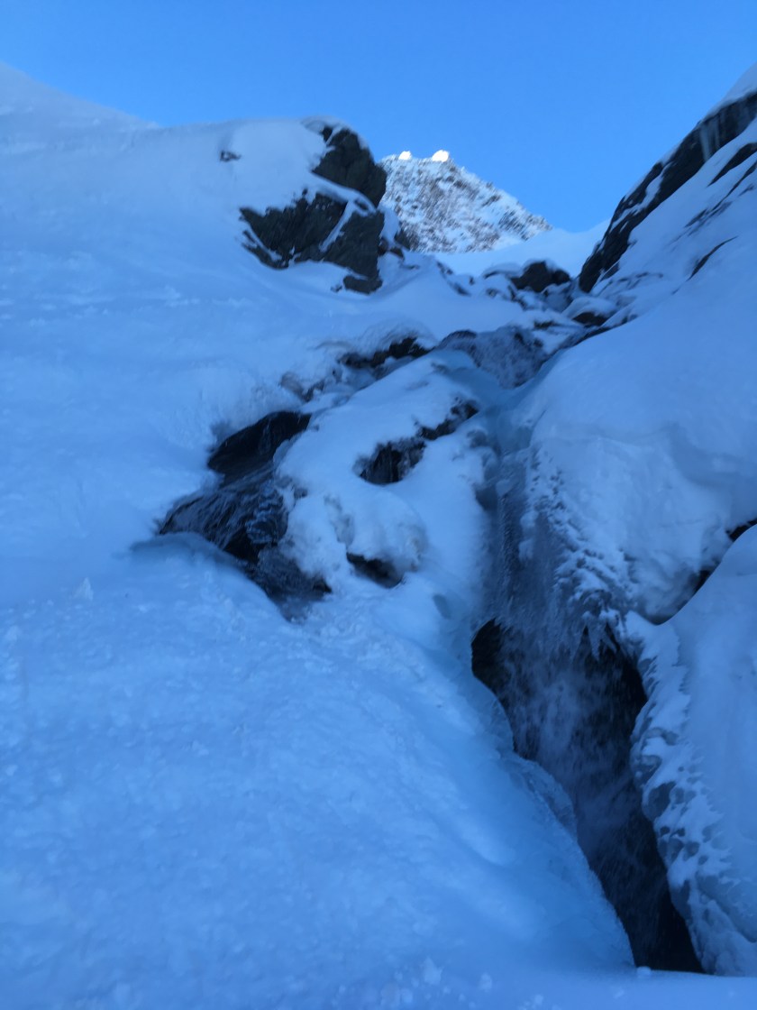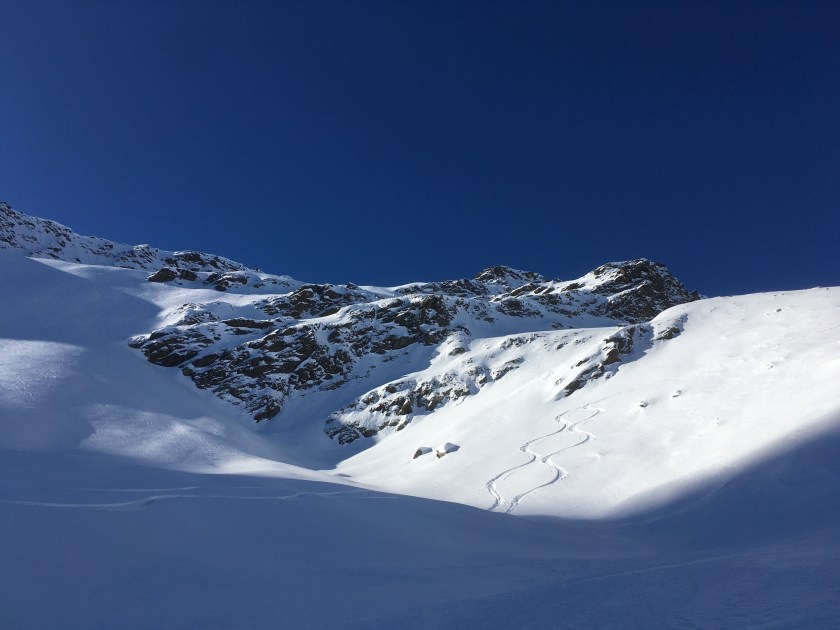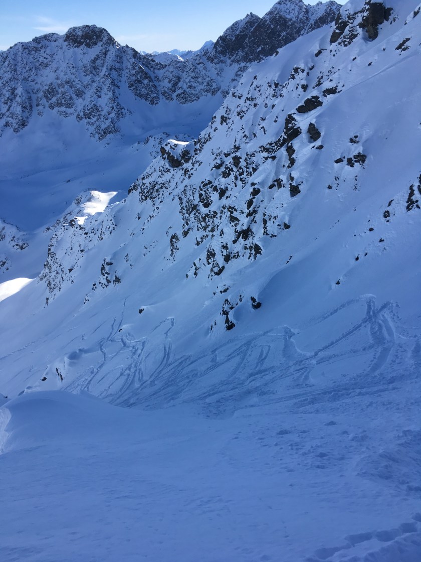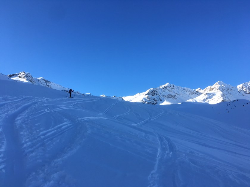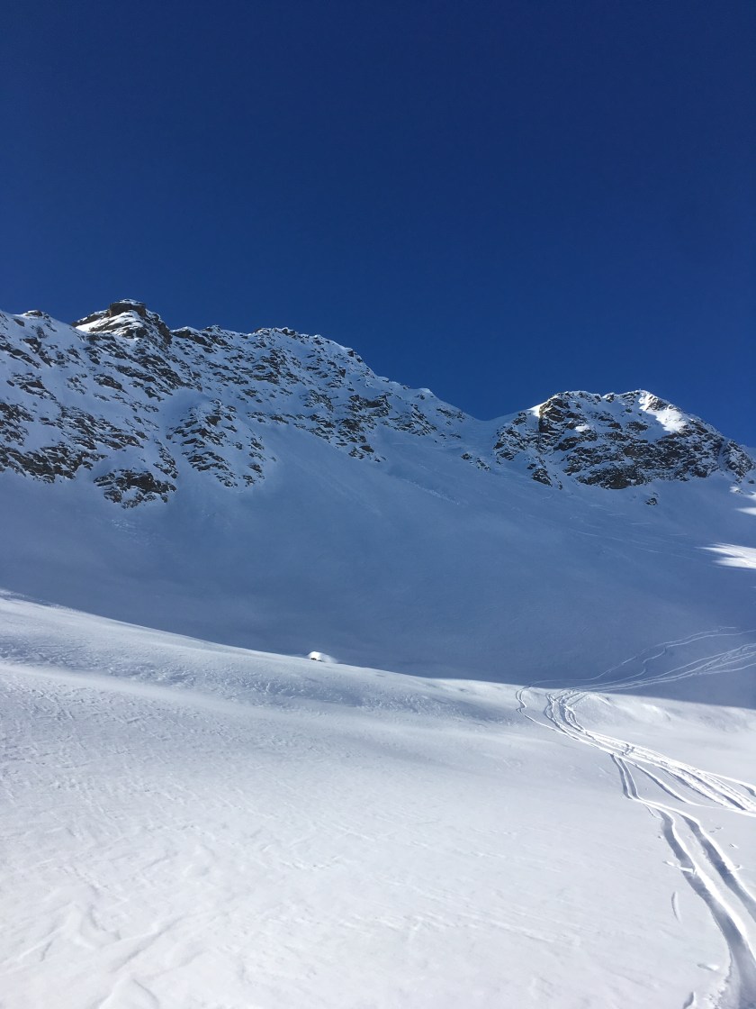 Heute durch den vom LWS ausgegebenen 1er gut machbar. Der Gipfelhang mit schönem etwas windgepresstem Pulver. Abfahrtsvariante links des Kaspressees geht gut, aber aufpassen auf Steinkonakt.