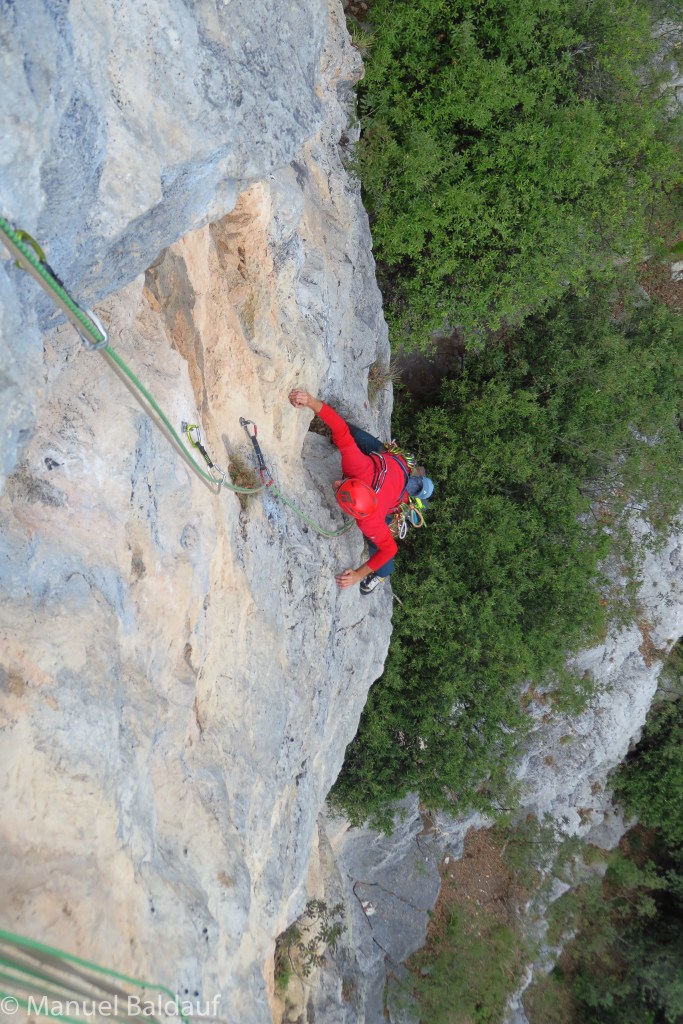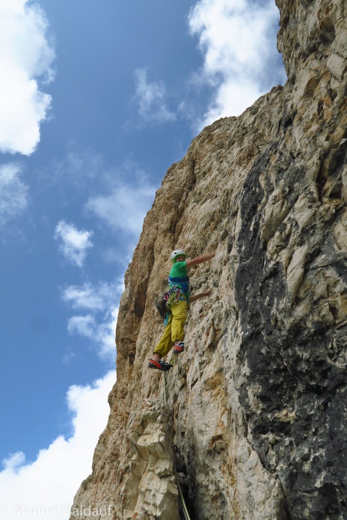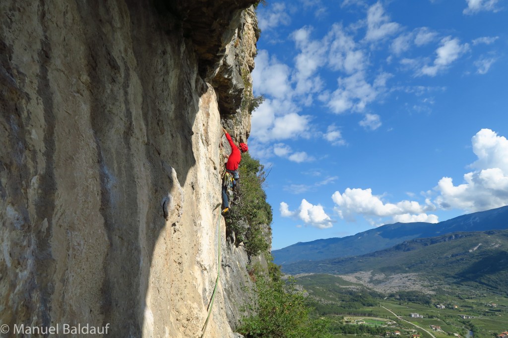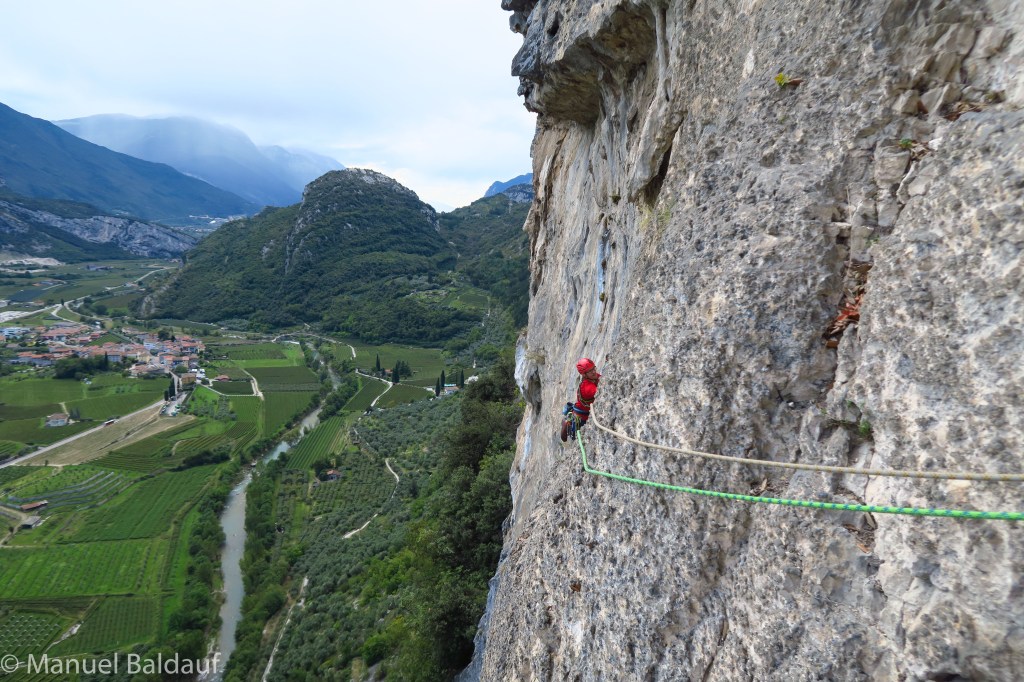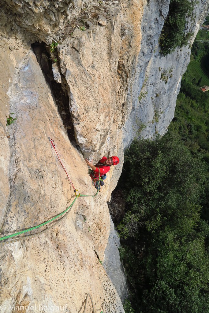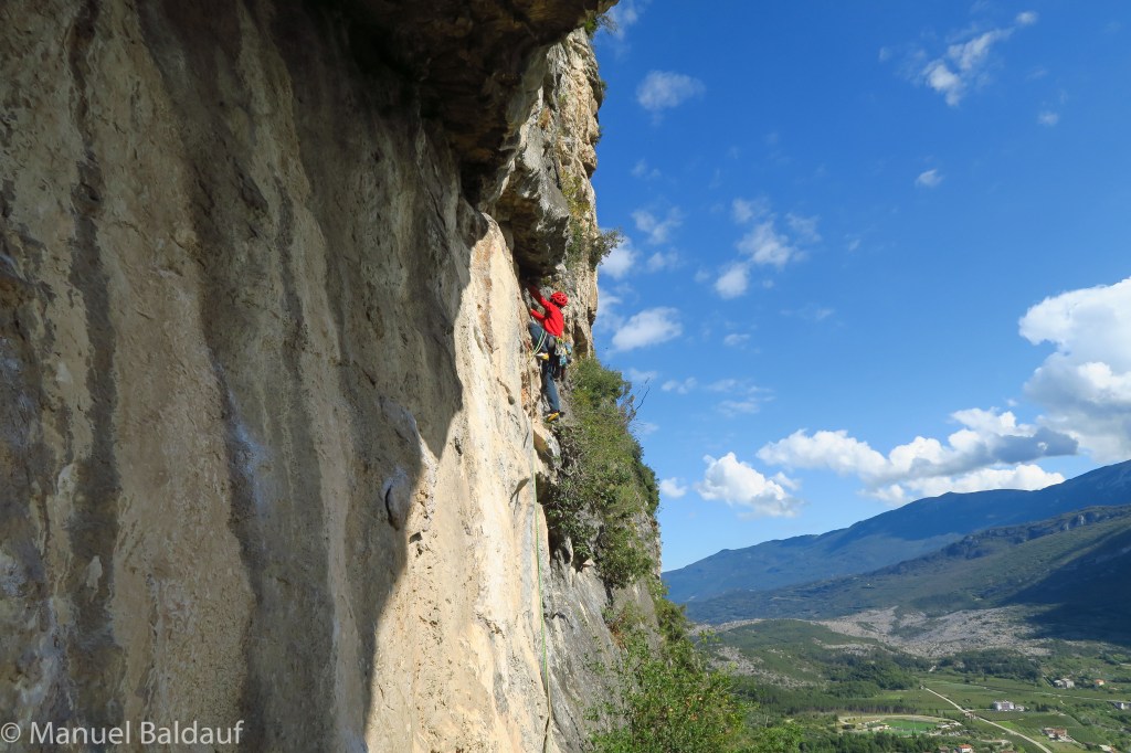 Charakter: Besser abgesichert als die Routen in Massone führt die Linie entlang von Verschneidungen und kleinen Überhängen elegant durch die Wand. Eigentlich gibt es keine „schiache“ Seillänge und am Schluss wartet mit der 6c Ausstiegsvariante sogar noch eine etwas pumpigere Seillänge. Sodass man schlussendlich doch das Gefühl hatte etwas getan zu haben 😉
