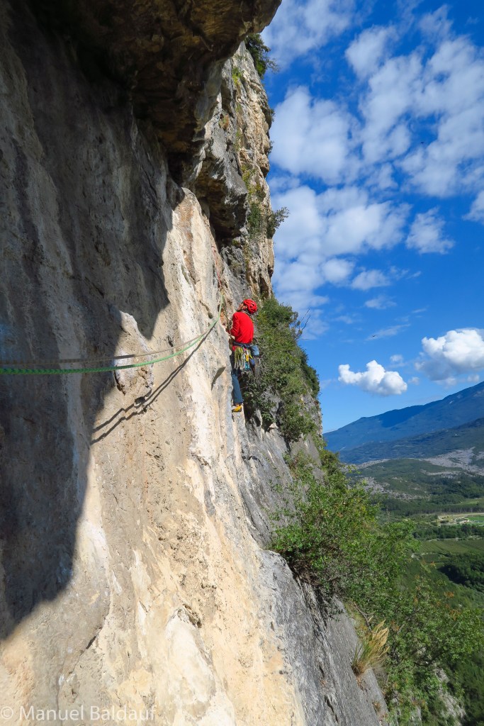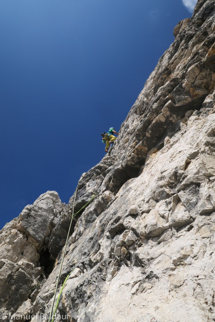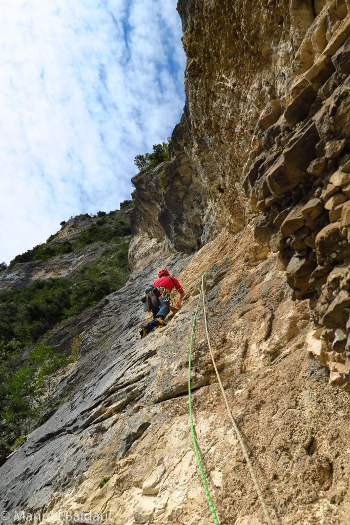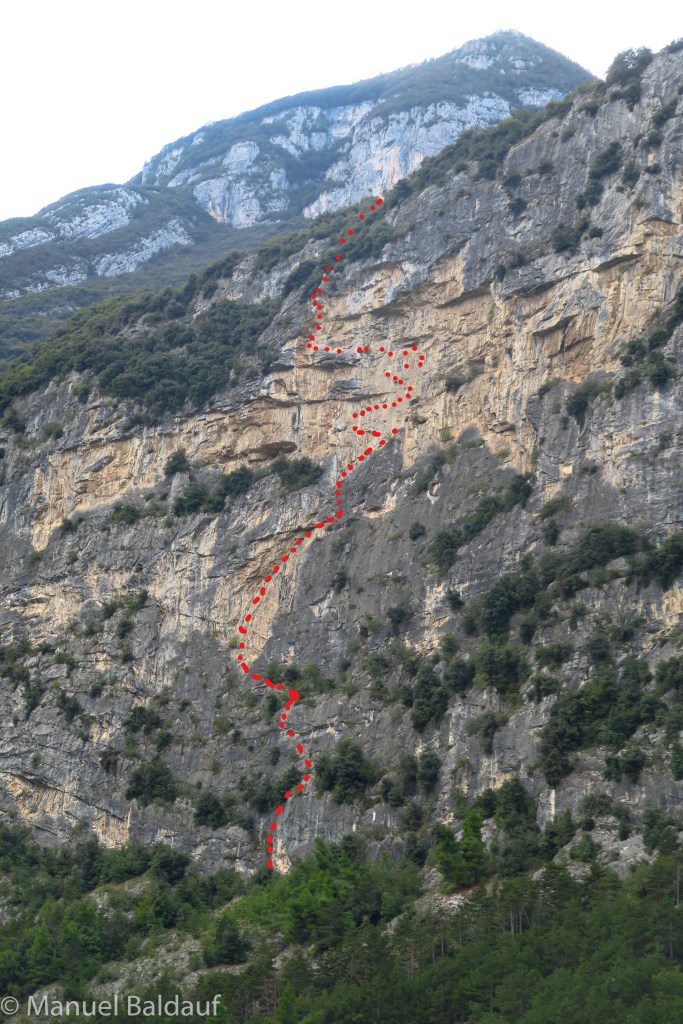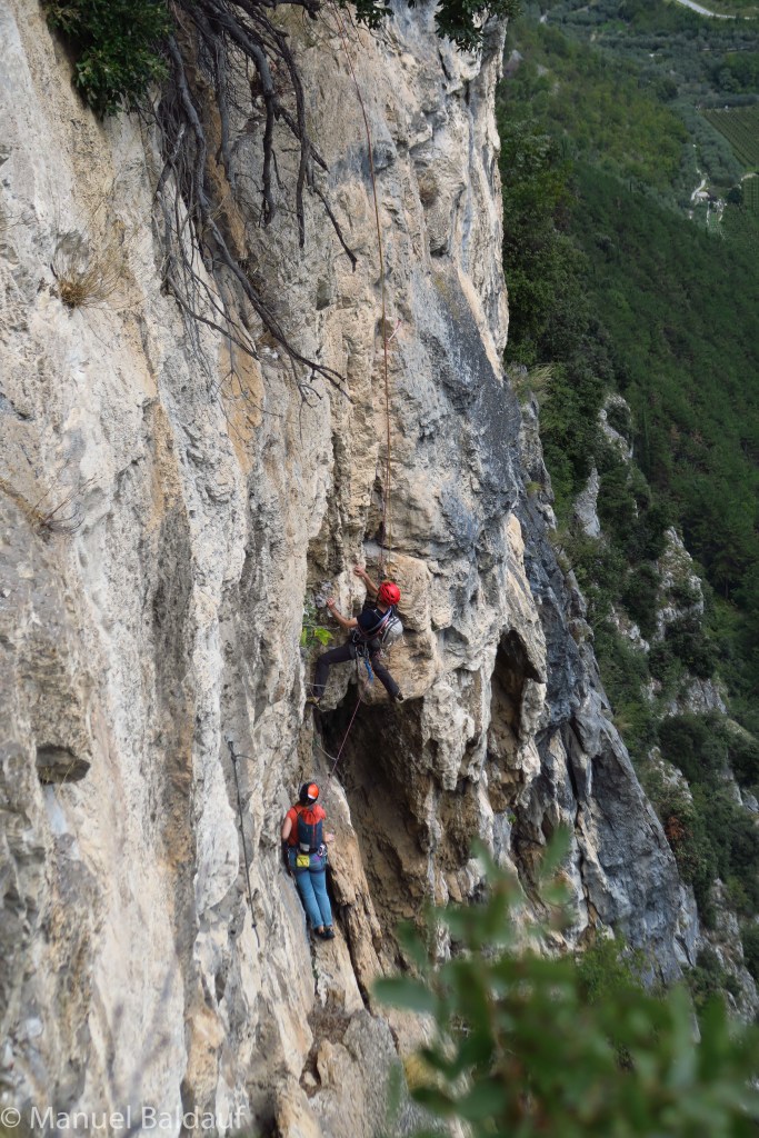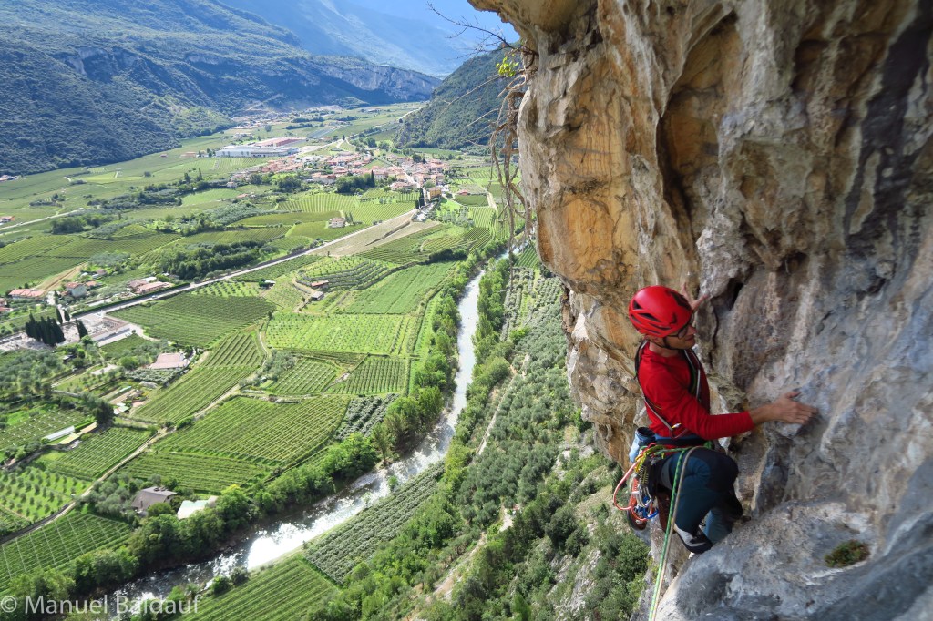 Charakter: Besser abgesichert als die Routen in Massone führt die Linie entlang von Verschneidungen und kleinen Überhängen elegant durch die Wand. Eigentlich gibt es keine „schiache“ Seillänge und am Schluss wartet mit der 6c Ausstiegsvariante sogar noch eine etwas pumpigere Seillänge. Sodass man schlussendlich doch das Gefühl hatte etwas getan zu haben 😉