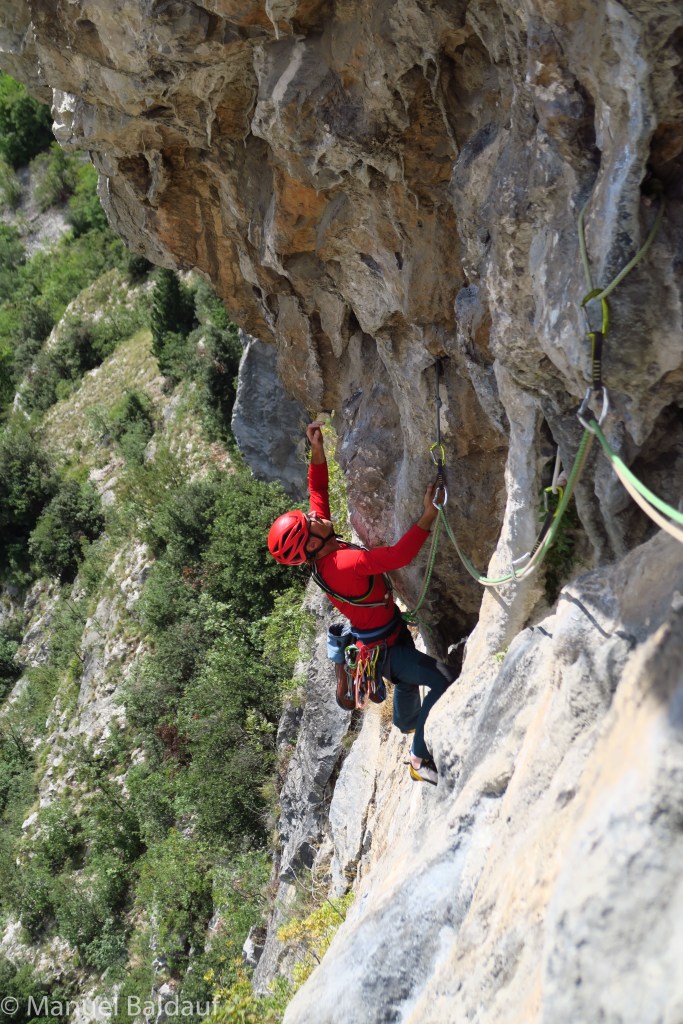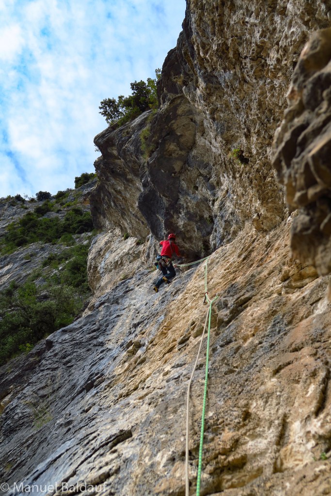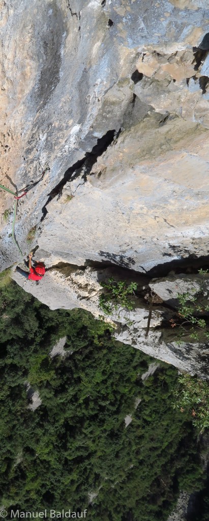 Das Highlight stellt sicher die 4. Seillänge dar wo man einen langen Quergang an Sintern und einem Überhang macht zu einem Hängestand an zwei Sanduhr Schlingen.