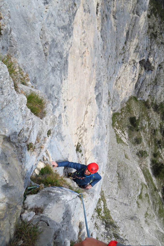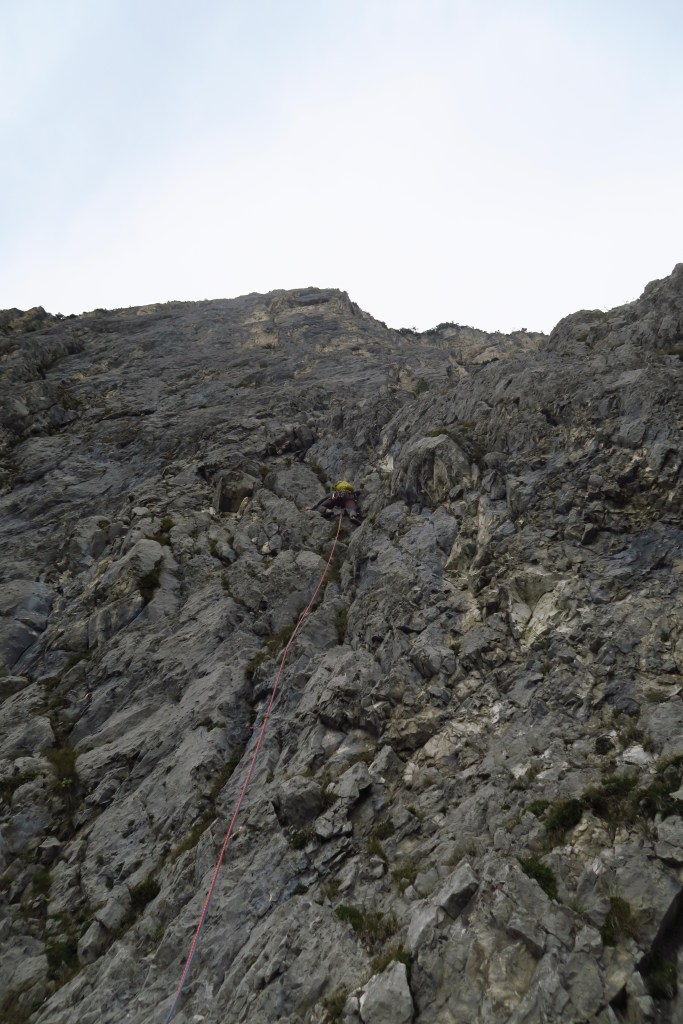 Eine spärliche Absicherung mit Schlaghaken und der nicht wirklich überall feste Fels lässt Spannung aufkommen wenn man so will.