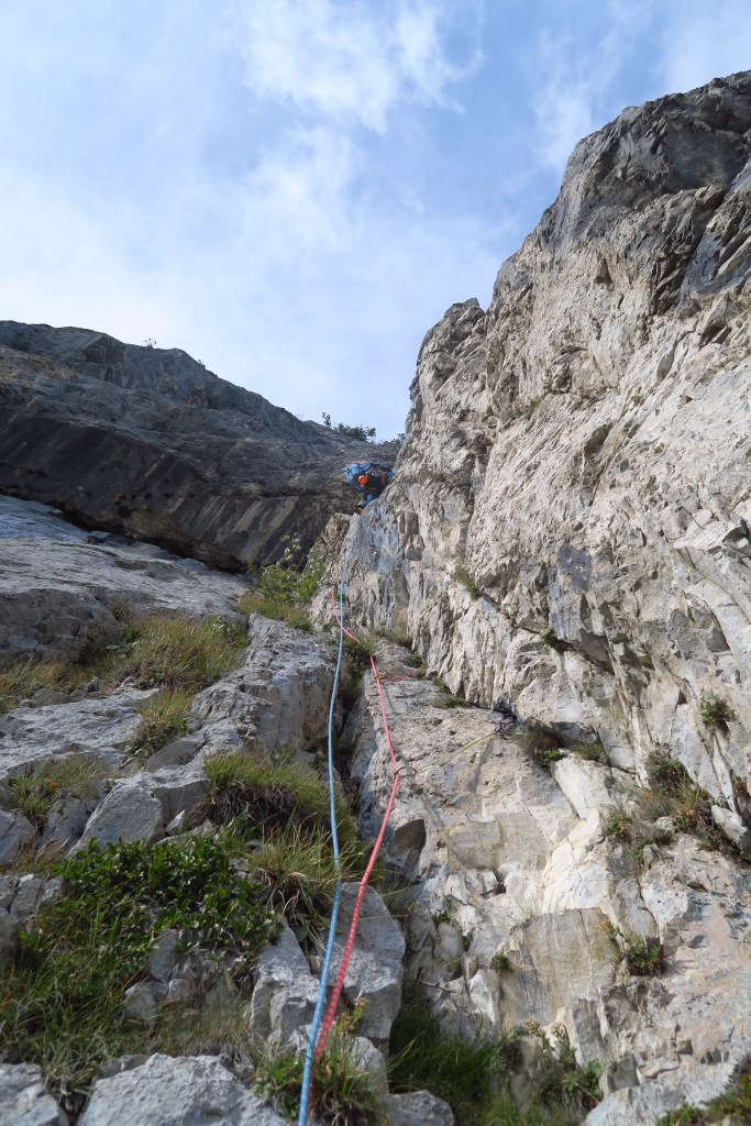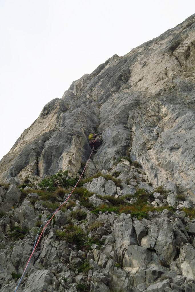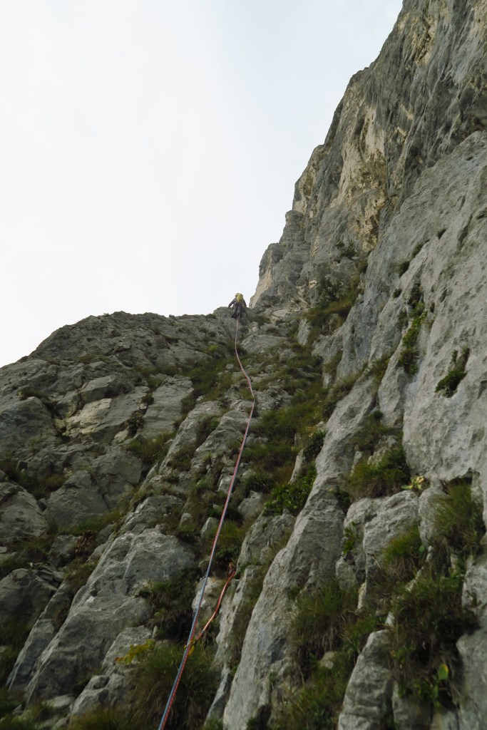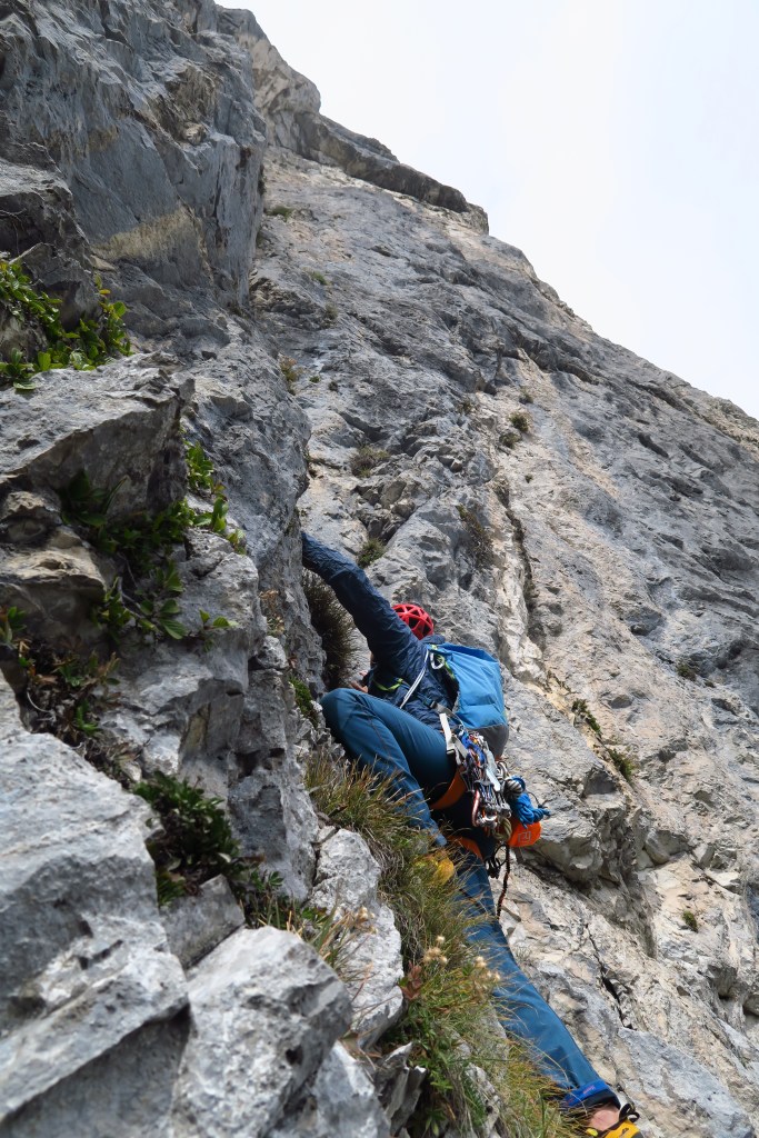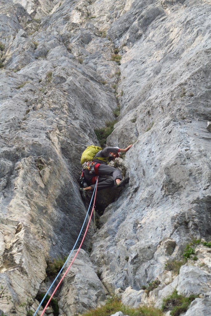 Die Tour ist jedoch alles andere als Plaisir und sollte nicht auf die leichte Schulter genommen werden. Auch wenn die Schwierigkeiten am Papier nicht allzu hoch wirken ist die Kletterei sehr gewöhnungs bedürftigt und die steilen Verschneidungen nicht leicht zu lesen. Darüber hinaus ist der Fels oft zum „mit nach Hause nehmen“. Sprich die Griffe sollten zuerst gut auf ihre Festigkeit geprüft werden.