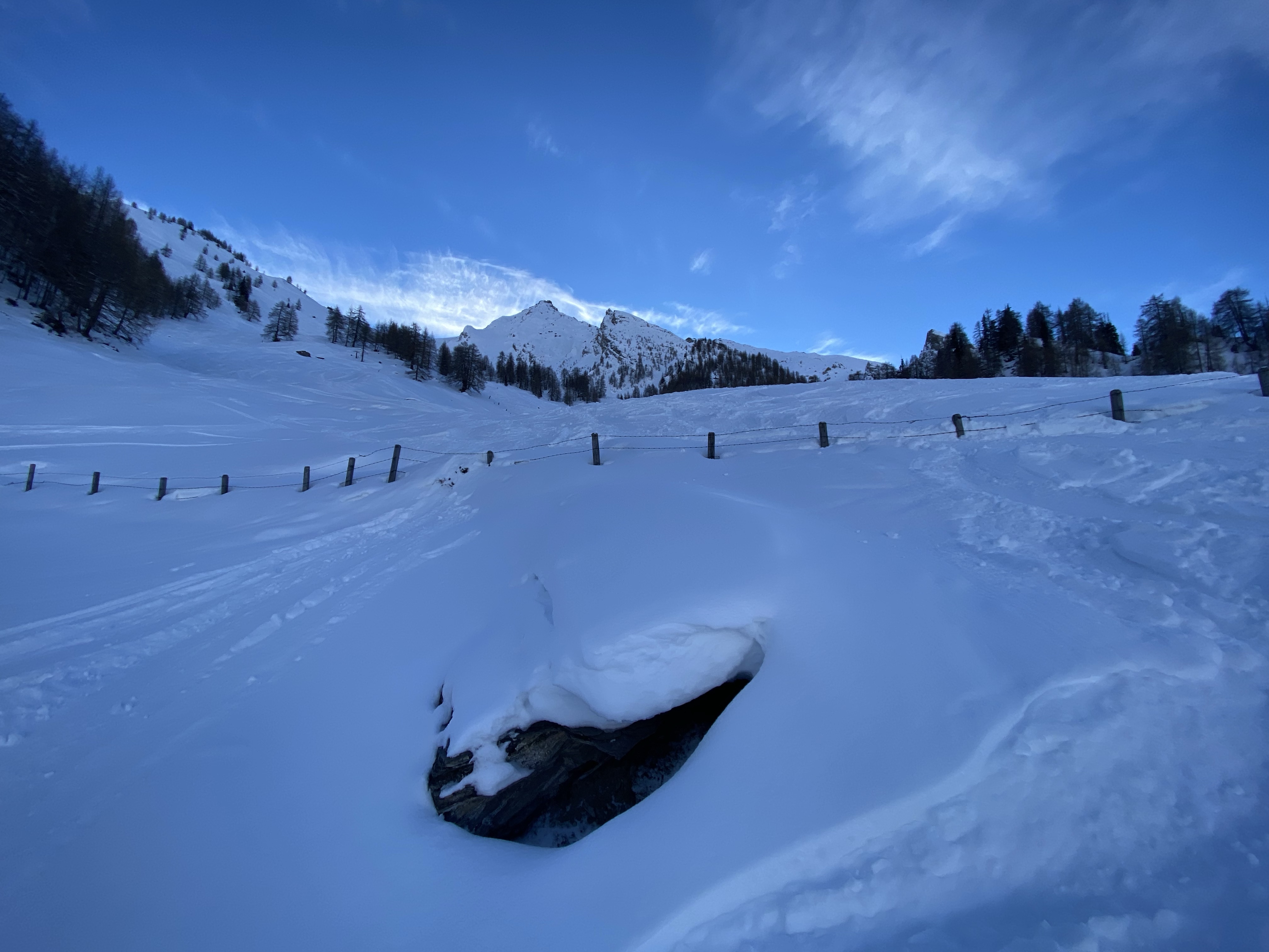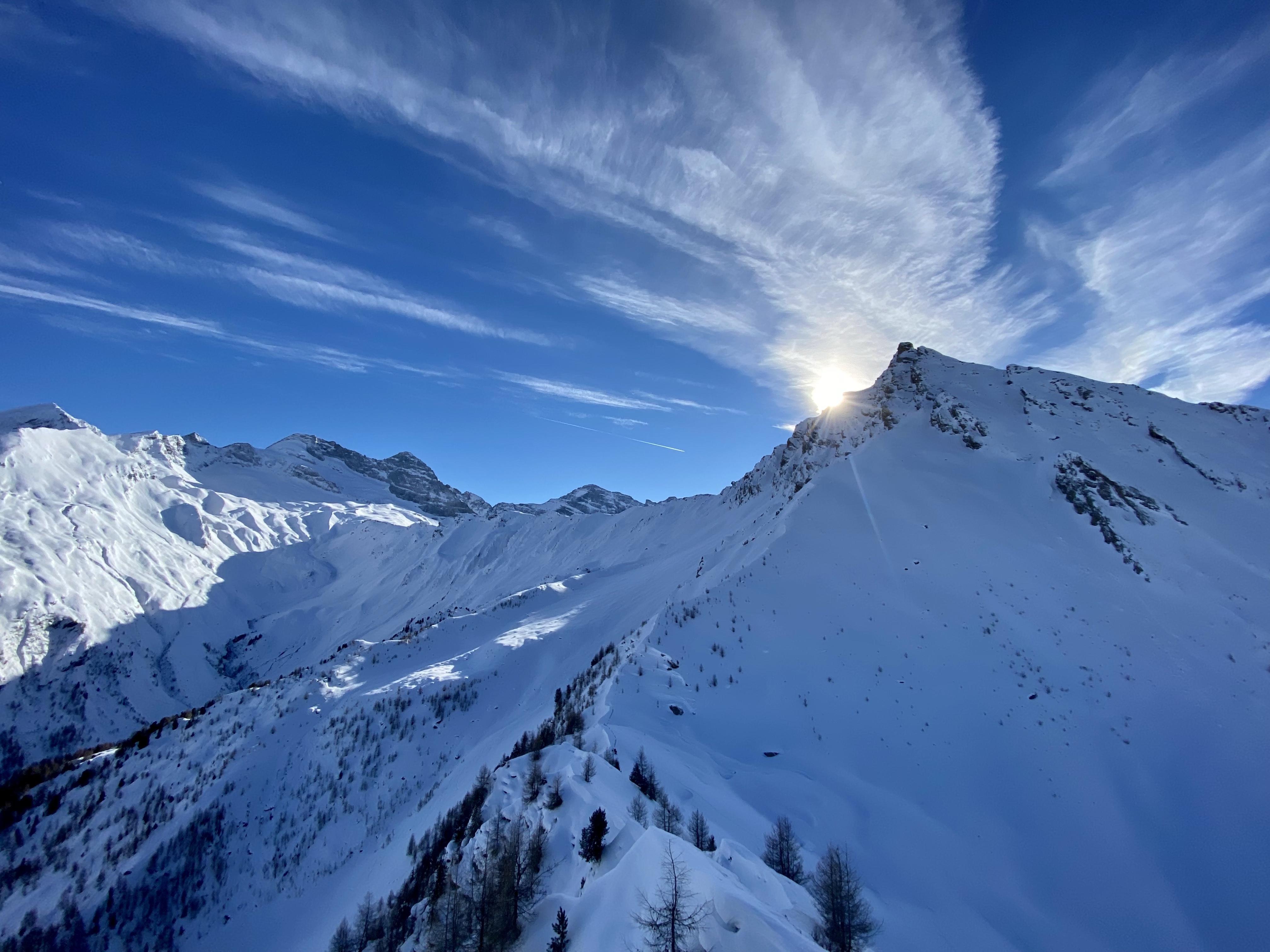 Heute habe ich noch einmal aufgefellt und dem oberen Bereich eine weitere Spur hinzugefügt. Oberhalb der Waldgrenze heute Pulver auf teilweise windgepresstem harten Untergrund. Die Waldschneise unten hat wenig Schnee und wird zusehends eisiger werden.