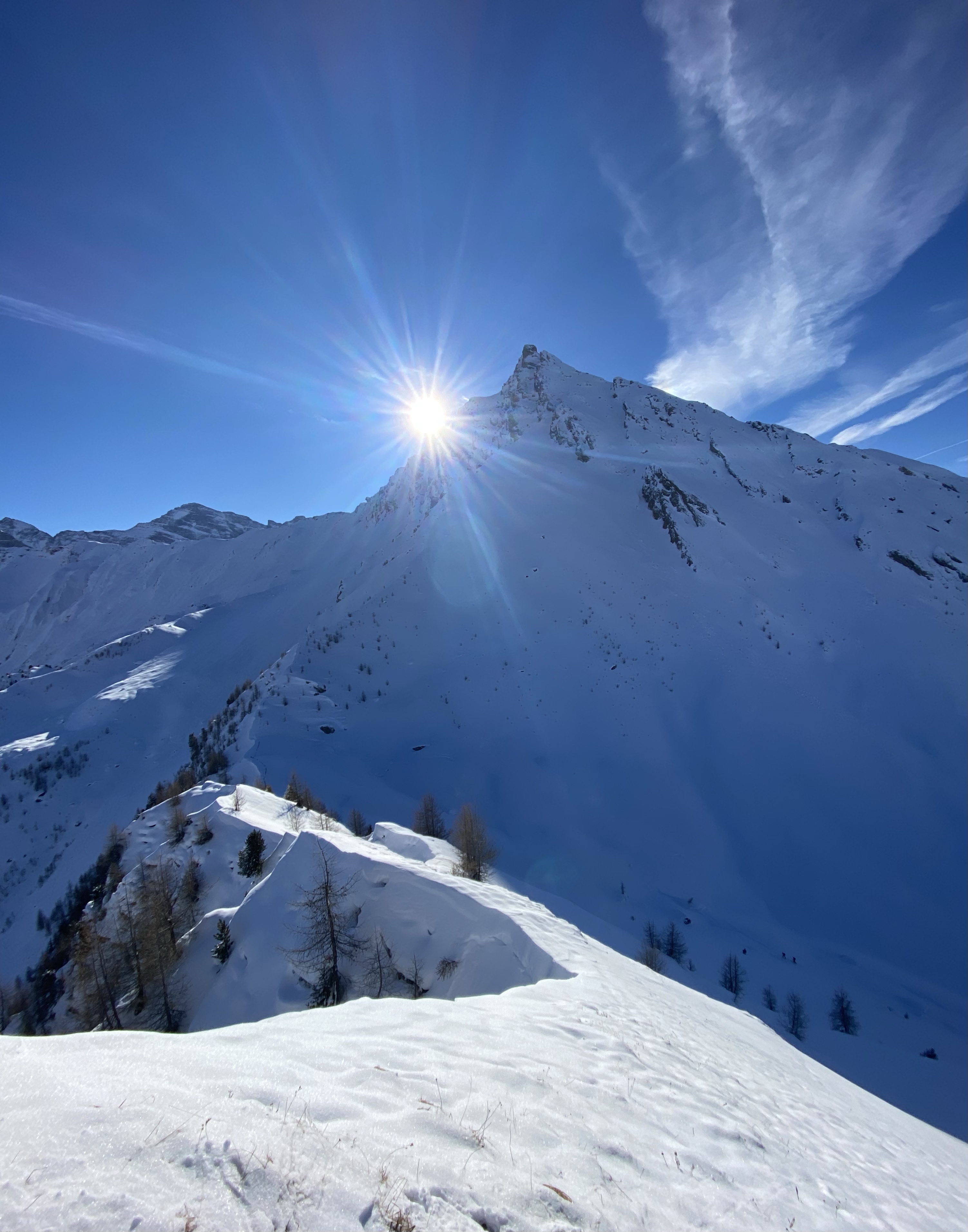Ich bin zuerst in Richtung des kleinen „Hüttels“ und habe dann den Hang nach links gequert. Hier ist etwas Vorsicht geboten bei unsicherer Lawinenlage. Bald sieht man den Gipfel der eigentlich ein ausgesetzter Gras bewachsener Kamm ohne Gipfelkreuz mit wenig Platz ist.