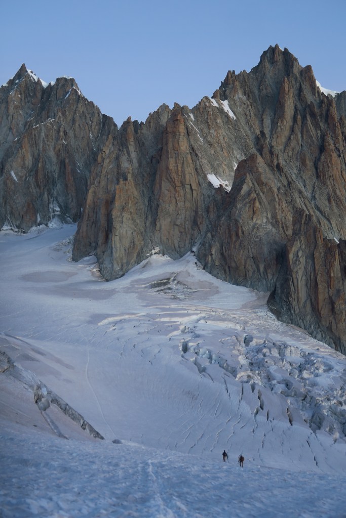 Eigentlich wollten wir nach der Schweizer Führe am Grand Capucin den Teufelsgrat angehen. Eine Gratkletterei über einige steile Zacken. Diese teuflische Unternehmung scheiterte aber an den höllischen Zuständen letzten Sommer. Das Einstiegscouloir bzw. Geröllfeld über das man den Einstieg zu der Tour erreicht war nämlich komplett zusammengebrochen. Ich konnte den Felssturz bereits am Vortag vom Grand Capucin aus hören, wusste aber nicht genau wo er war.