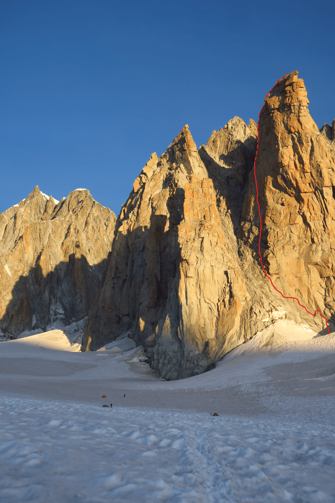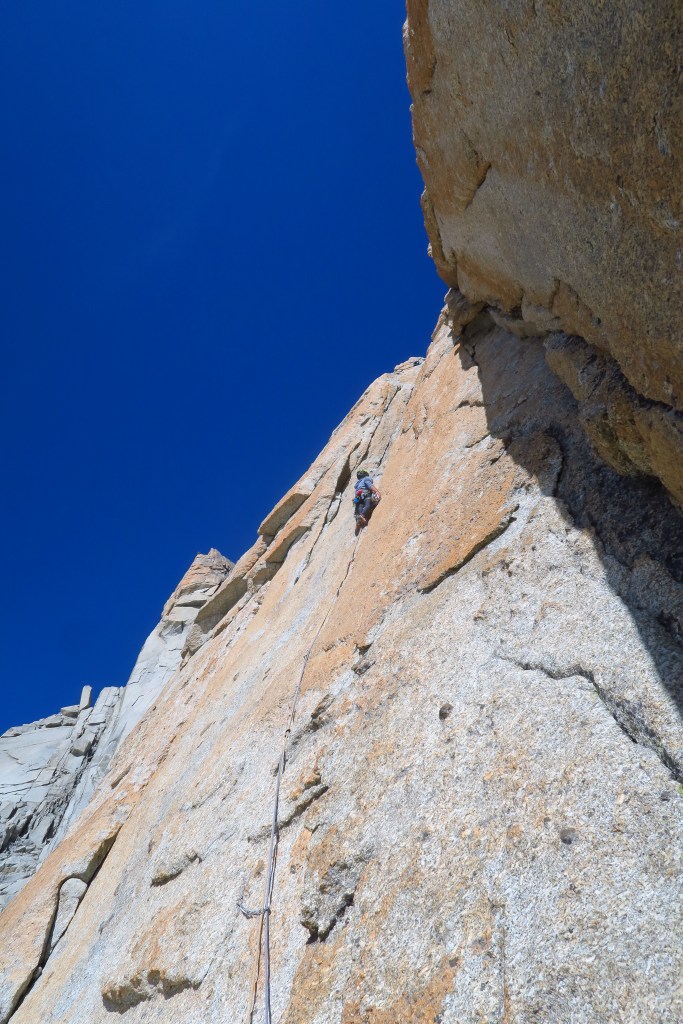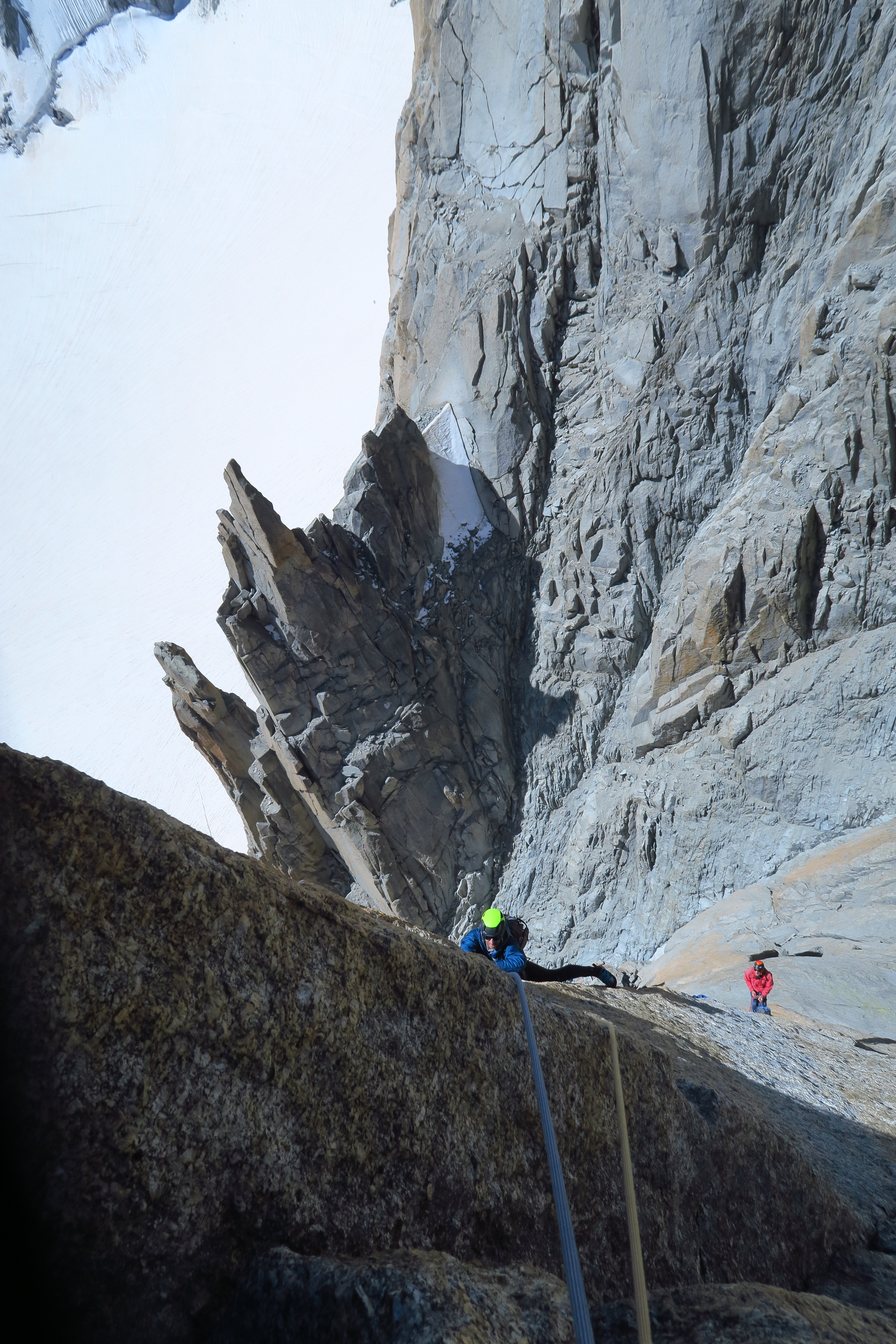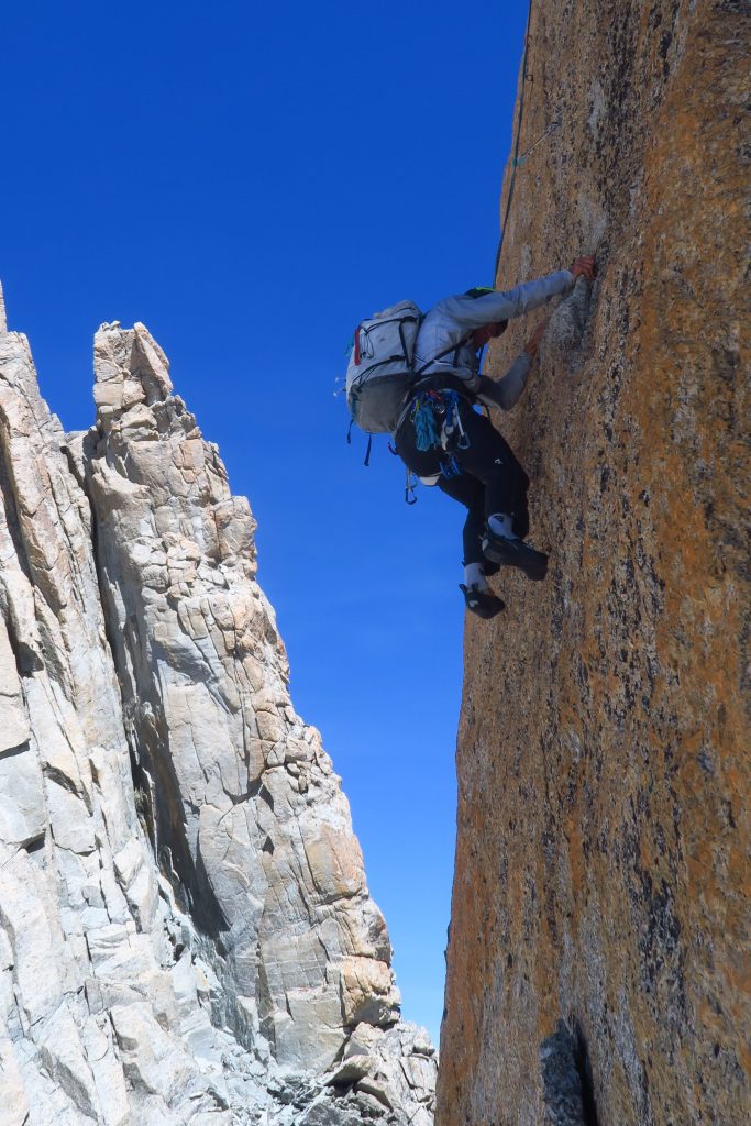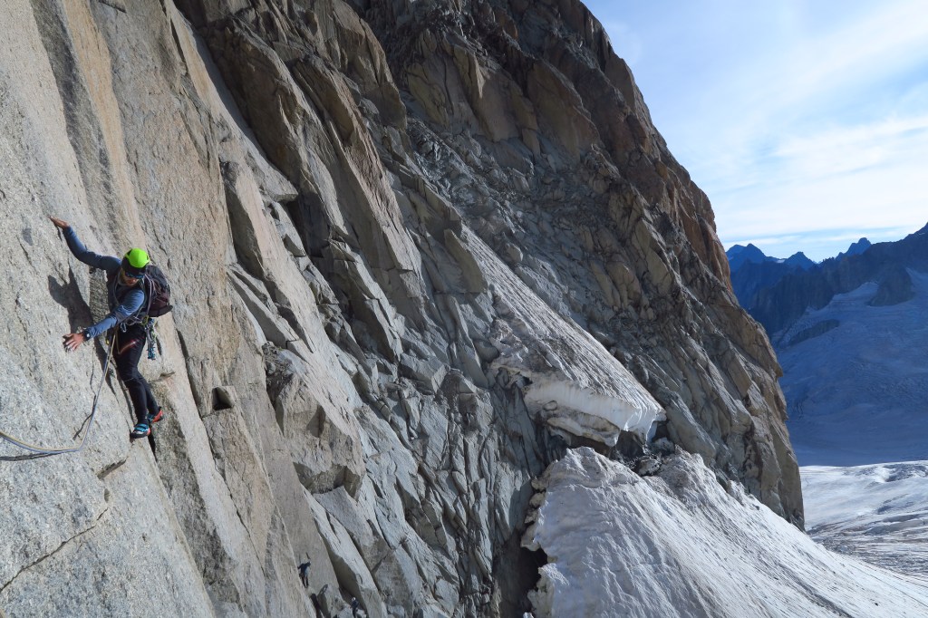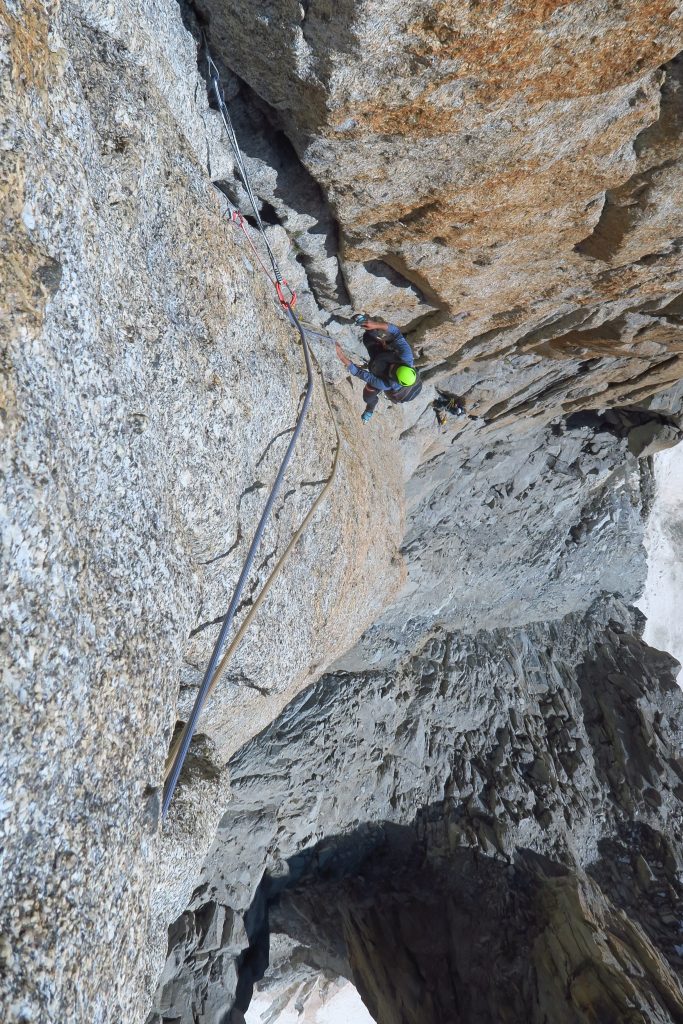 Als eigenständigen Berg hätte ich Ihn trotzdem nicht bezeichnet. Vielmehr ein 400 Meter hoher Felsobelisk aus rot braunem Granit der aus der Gletschermasse herauswächst. In diesem Jahr ist das Schneefeld über welches man normal zum Einsteig kommt schon fast komplett verschwunden. Deshalb starten wir etwas weiter rechts gleich direkt im Fels mit einer kurzen knackigen Einzelstell und anschliessender Linksquerung. Schon hier lässt sich der Charakter der Tour erahnen. Immer wieder mal ein Bolt aber dazwischen ist durchaus Eigeninitative beim Absichern gefragt. Die Umgebung ist wild und man fühlt sich weit entfernt von jeglicher Zivilisation.
