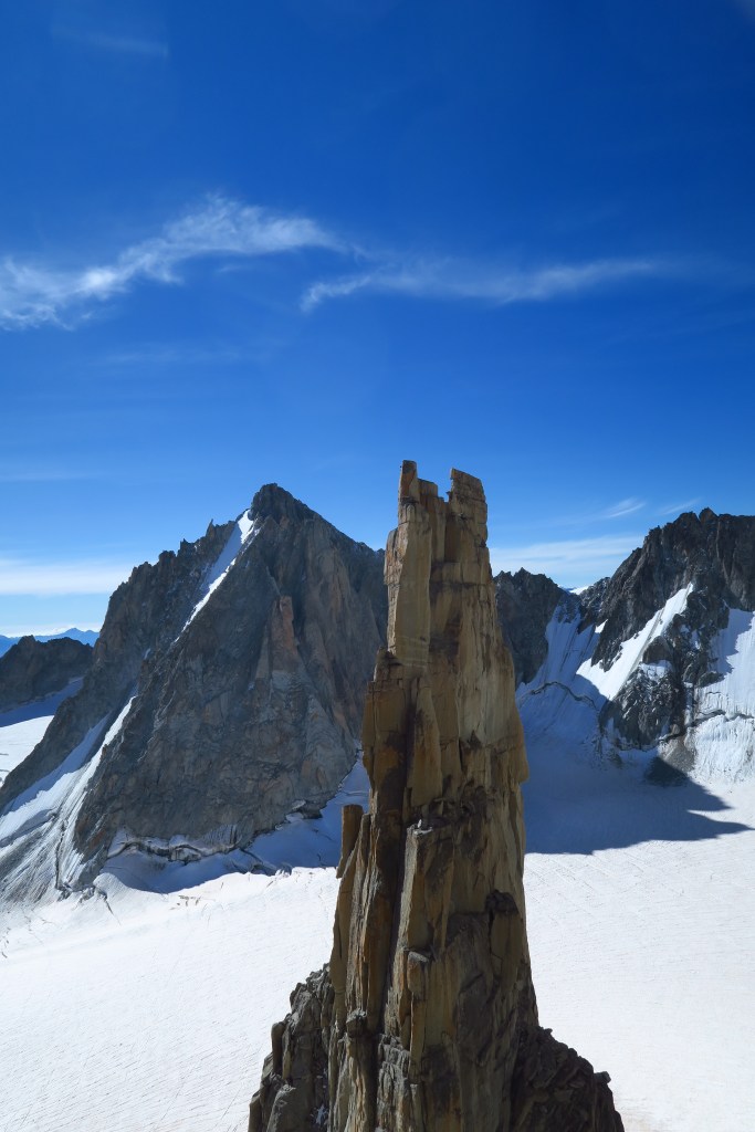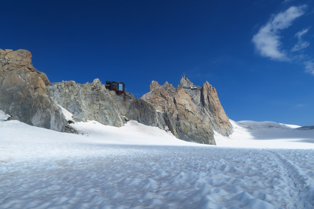 Wir wollten uns trotzdem ein eigenes Bild machen und so fuhren wir mit der Seilbahn zur Aiguille du Midi. Um den Nachmittag noch zu nutzen kletterten wir eine kleine Tour an der Eperon de Cosmiques, die Rebuffat. In 6. SL geht es über schönen roten Granit nach oben. https://www.planetmountain.com/english/rock/routes/itineraries/scheda.php?id_itinerario=347&lang=eng&id_tipologia=38