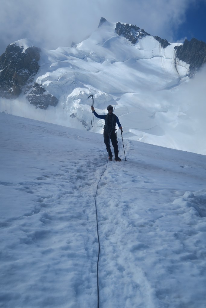 Am Col du Maudit war ich erleichtert aus dem Gefahrenbereich zu sein und konnte Xander nachsichern. Nun ging es über mehrere Spalten Zonen etwas abwärts in die Einsattelung zum Mont Blanc. Ab hier ist die Route technisch nicht mehr schwierig doch der Anstieg zieht sich noch.