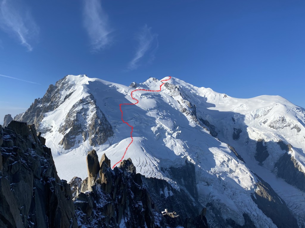 Die ungefähre Route über Mt. Blanc du Tacul, Mont Maudit und ganz hinten der Schneekopf des Mont Blanc.