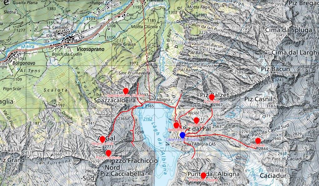 Von Basecamp beim Stausee geht es an der Albingnahütte vorbei in ca. 45 Minuten zu den Einstiegen der Routen welche zwischen 5 und 7 Seillängen haben.