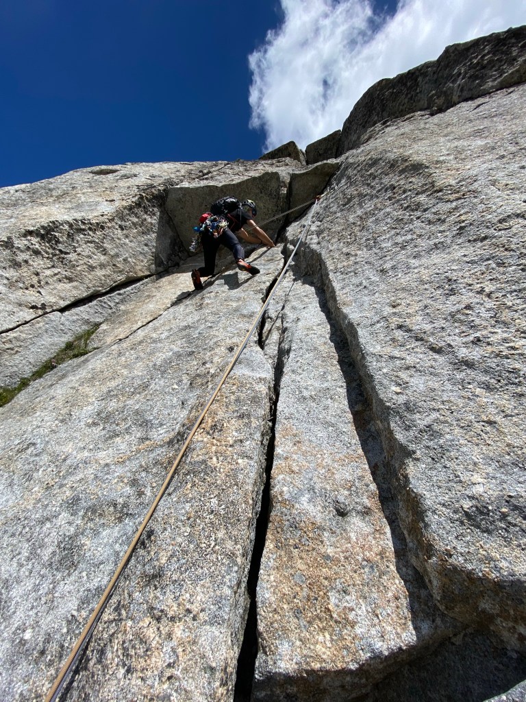 Man kommt dann auf einen weiteren Vorbau von dem man entweder am Grat bleiben oder rechts über leichtes Gelände (4C) höher steigen kann. Wir klettern am laufenden Seil weiter und nach einer kurzen Abseilstelle und etwas Gehgelände erreichen wir die erste Granitnadel den sogenannten Dente. Über 2 Seillängen lässt sich der dünne Gipfel erreichen. Wobei die zweite 6b Länge die einen glatten Fingerriss empor führt gar nicht zu unterschätzen ist. Wenngleich die Absicherung plaisir bleibt.
