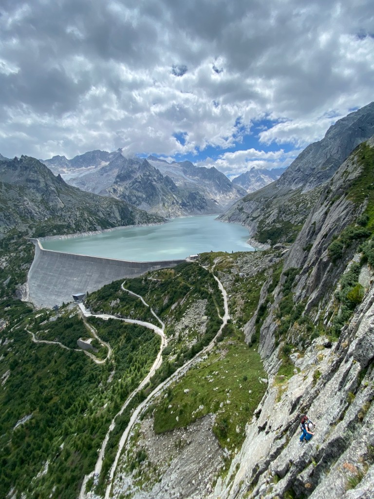 Am Samstag ging es mit der kleinen Seilbahn von Pranzaira rauf zum Albignastausee auf 2.162 Metern. Dort wollten wir zum Einklettern für unseren bevorstehenden Chamonix Trip eine der vielen schönen Granitrouten klettern. Den Tipp habe ich von meinem Freund Michi erhalten der ein paar Wochenenden vorher hier war.