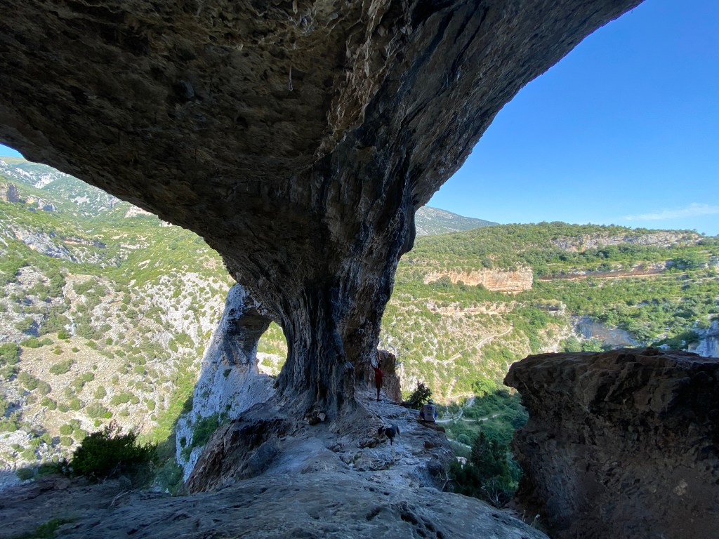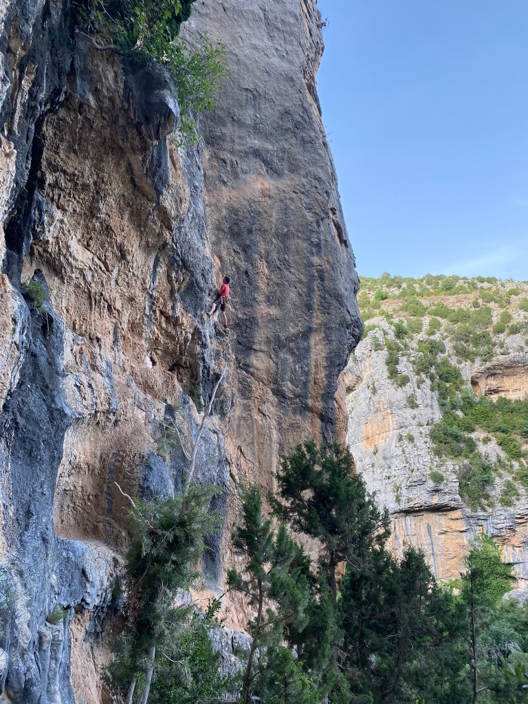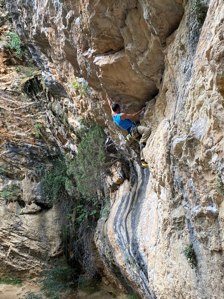 Mit letzterem kann man auch die langen Routen z.B. im Sektor Laperne (der Sektor genau gegenüber der Terrasse vom Kalandraka) klettern. Die Route „La Cecilia de Sevilla“ 7a+ ist so eine lange Tour. Bei Hitze fühlt sie sich auch nicht gerade geschenkt an mit einer knackigen Stelle in der Mitte und recht sportlichen Hakenabständen.