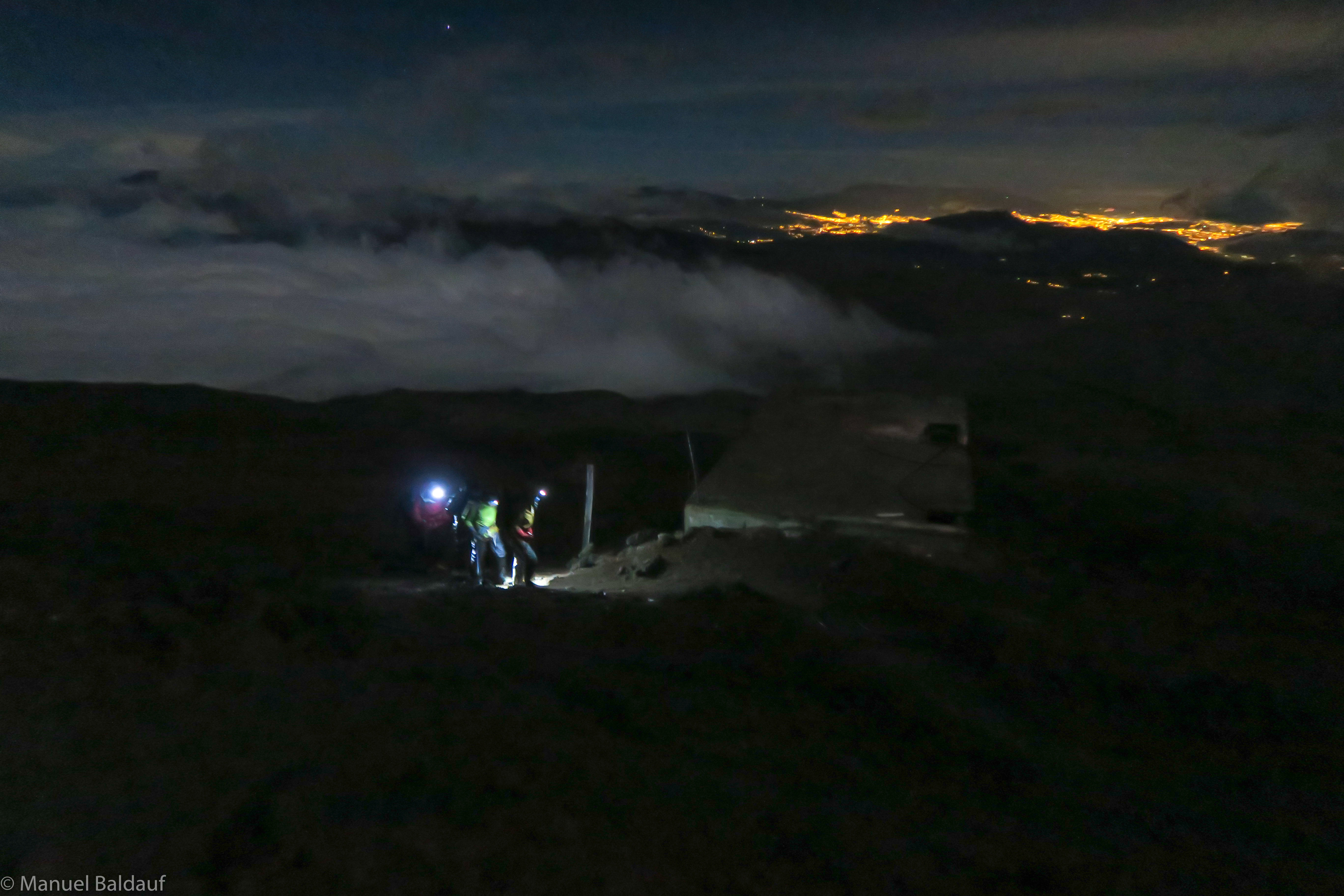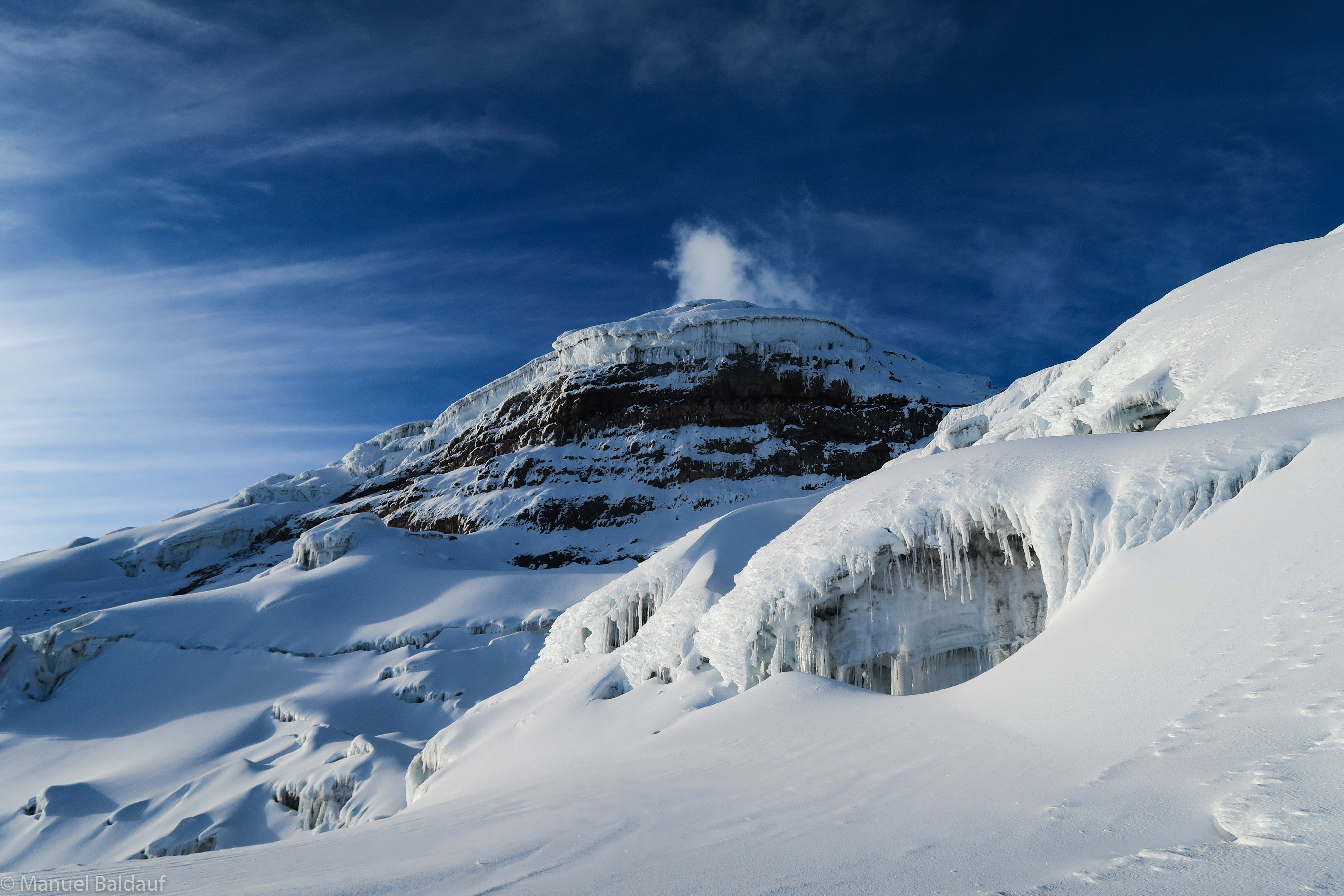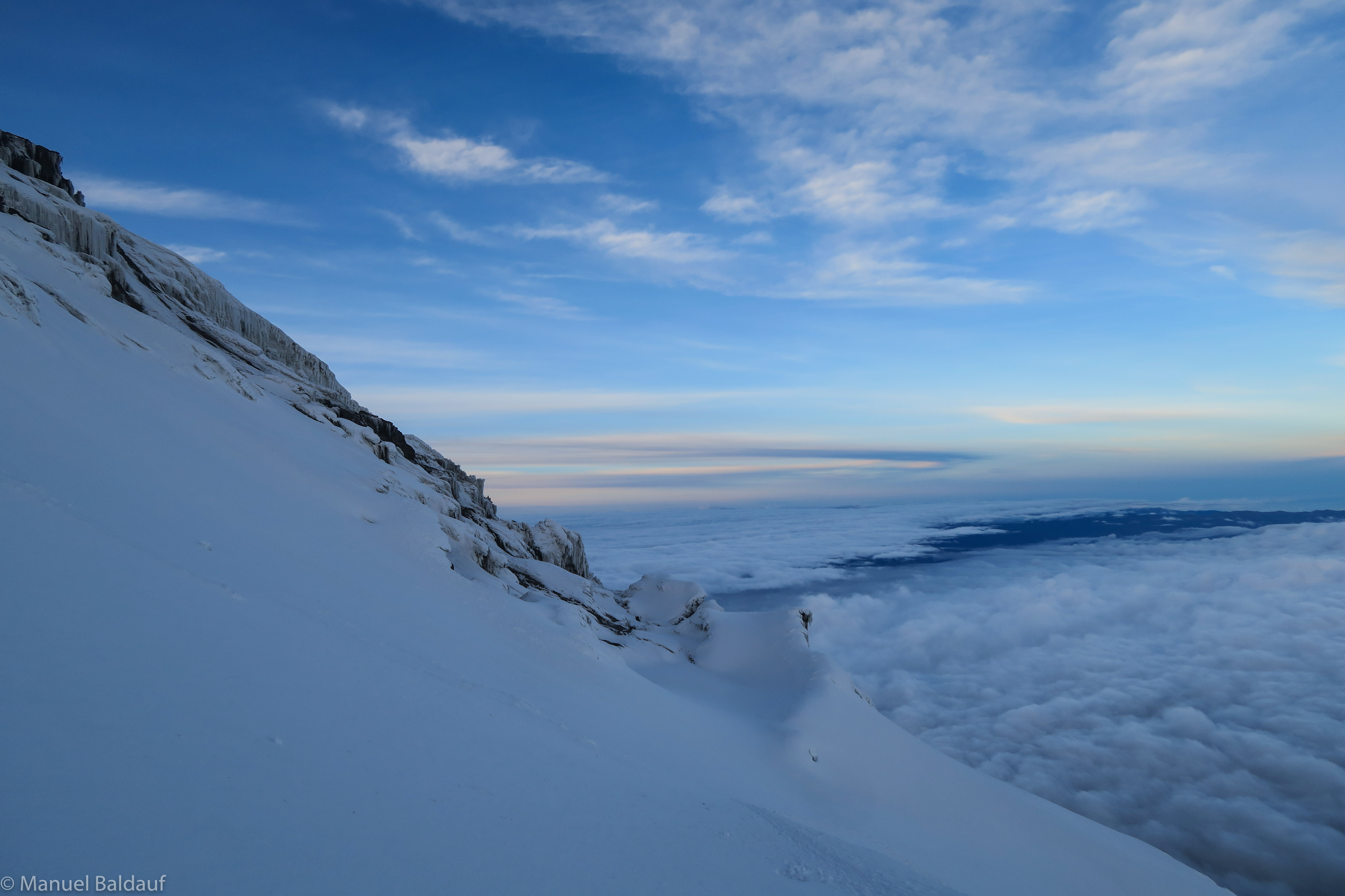 A bit of mountaineering knowledge also helps on the approach on the Glacier where you need crampons and an ice axe. Addiotionally it is considered to take a mountain guide, first for route finding and the approach in the night and secondly park entrance won’t let you pass if you don’t have a guide. The route itself isn’t difficult and consits mostly of walking on snow sometimes up to 45° steep. There are also some huge crevasses which have to be watched out.